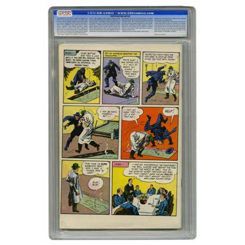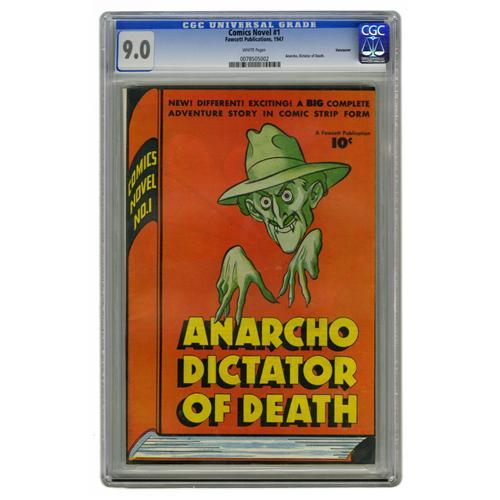 <B>Comics Novel #1 Anarcho, Dictator of Death - Vancouver pedigree (Fawcett, 1947) CGC VF/NM 9.0 White pages.</B></I> This is the nicest copy CGC has certified of this issue to date, and this comic is a tough find in high grade thanks to black borders that expose all manner of "dings," as well as a very smudge-prone orange area. No smudges on this copy, though! In fact, it looks as if a minor bend (with no color break) at the bottom right was the only thing keeping this copy from a 9.2 or higher. This oddball one-shot is a book-length anti-fascist story, and the hero of the piece is our old pal Radar the International Policeman, whom we know from many an issue of <B>Master Comics</B></I>. Overstreet 2006 VF/NM 9.0 value = $257; NM- 9.2 value = $340. CGC census 4/06: 1 in 9.0, none higher.