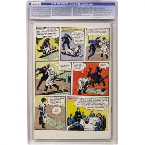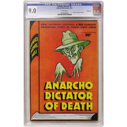 <B>Comics Novel #1 Anarcho, Dictator of Death - Vancouver pedigree (Fawcett, 1947) CGC VF/NM 9.0 White pages.</B></I> This is the nicest copy CGC has certified of this issue to date, and this comic is a tough find in high grade thanks to black borders that expose all manner of "dings," as well as a very smudge-prone orange area. No smudges on this copy, though! In fact, it looks as if a minor bend (with no color break) at the bottom right was the only thing keeping this copy from a 9.2 or higher. This oddball one-shot is a book-length anti-fascist story, and the hero of the piece is our old pal Radar the International Policeman, whom we know from many an issue of <B>Master Comics</B></I>. Overstreet 2007 VF/NM 9.0 value = $270; NM- 9.2 value = $365. CGC census 6/07: 1 in 9.0, none higher.<BR><BR><b>Shipping:</b> Comics - Slabbed (certified) (<a target="_blank" href="http://www.heritageauctions.com/common/shipping.php">view shipping information</a>)