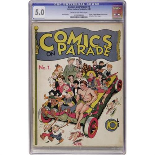 <B>Comics On Parade #1 (United Features Syndicate, 1938) CGC VG/FN 5.0 Cream to off-white pages.</B></I> The first issue of a title that ran for 17 years. It features Hal Foster art and strip reprint appearances by Tarzan, Captain and the Kids, Li'l Abner, and Broncho Bill. Overstreet 2007 VG 4.0 value = $712; FN 6.0 value = $1,068. CGC census 6/07: 1 in 5.0, 1 higher.<BR><BR><b>Shipping:</b> Comics - Slabbed (certified) (<a target="_blank" href="http://www.heritageauctions.com/common/shipping.php">view shipping information</a>)
