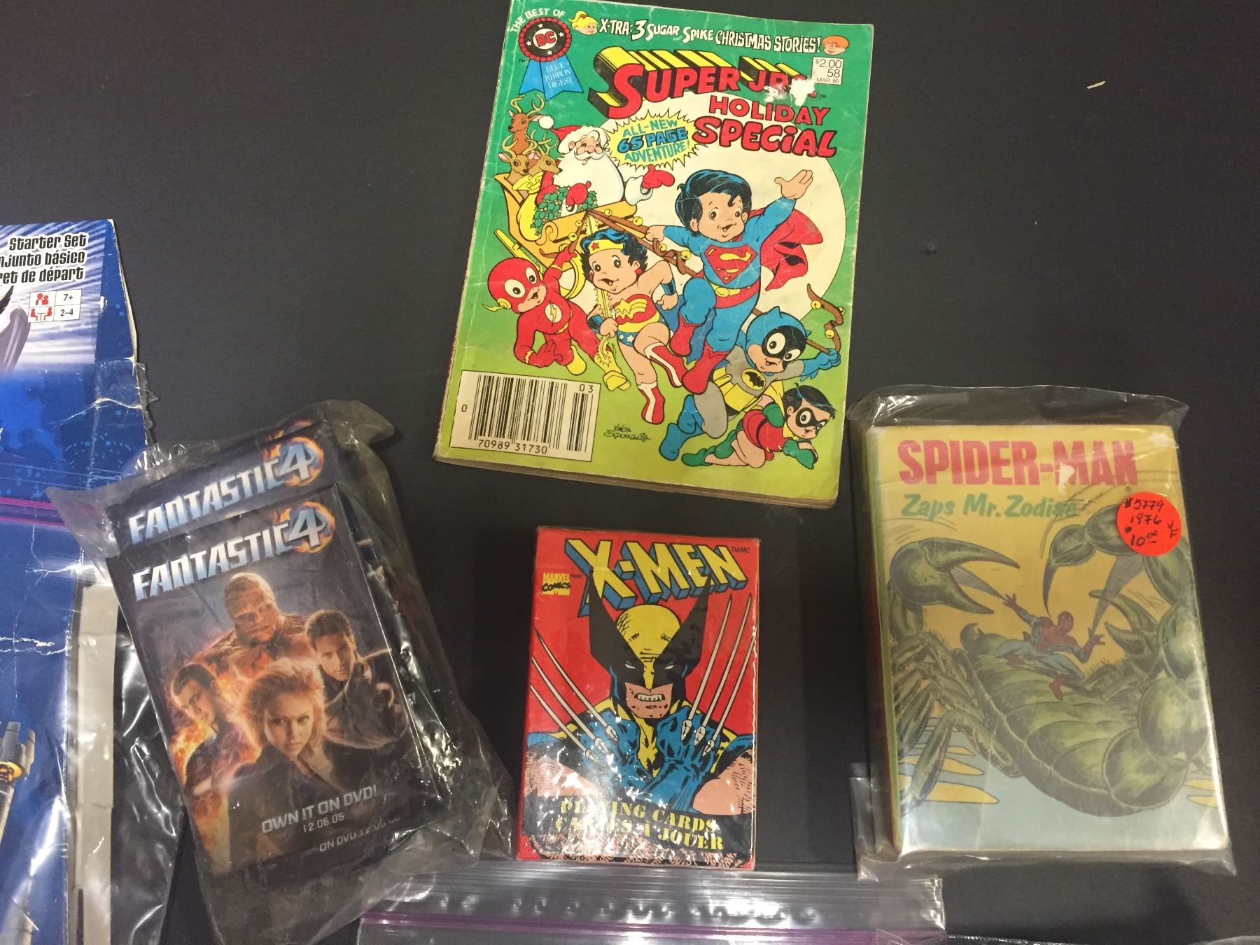 Comics Related Shelf Lot. X-men Playing Cards, Fantastic Four Trading Cards, Superman The Story of, and Justtice League Tokens