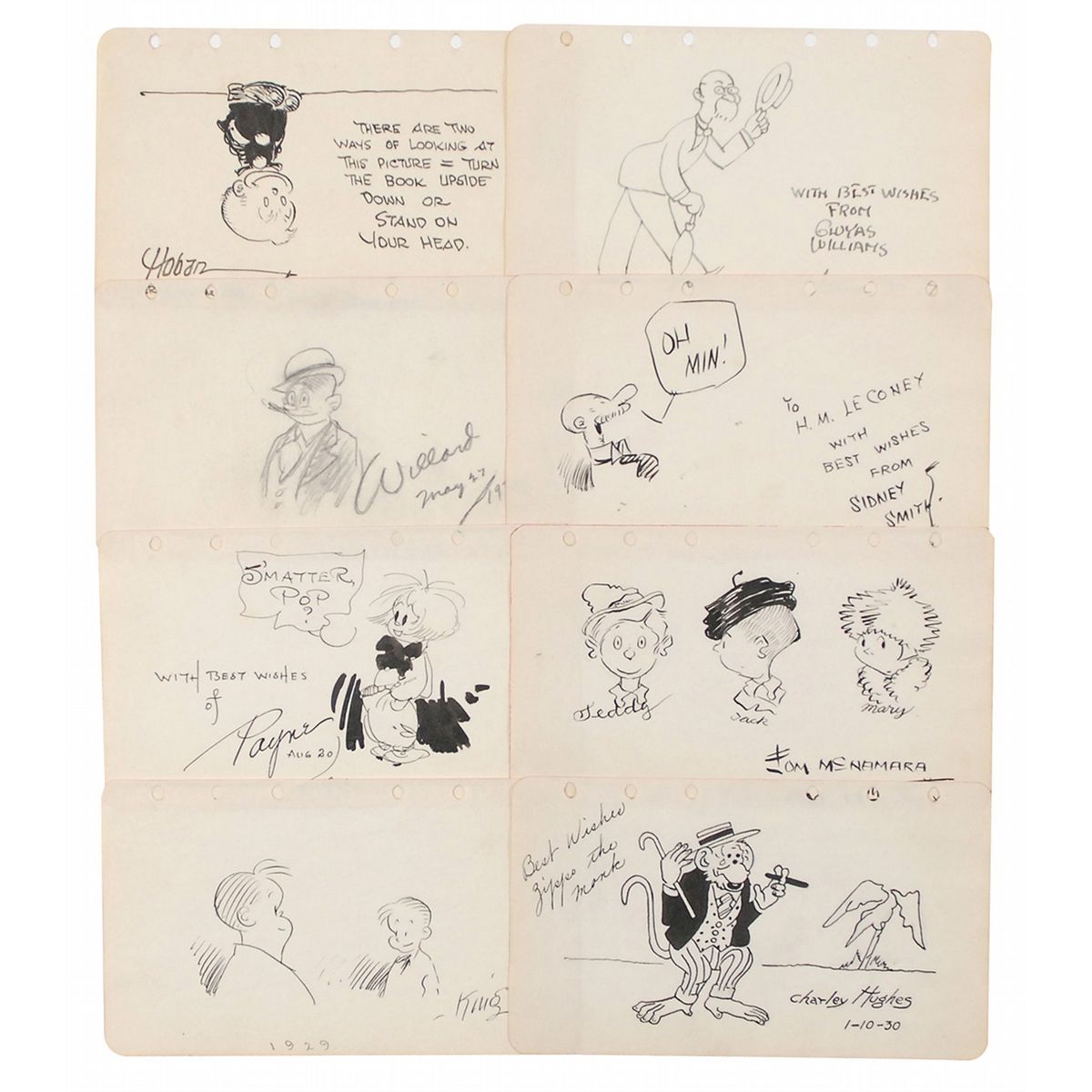 Eight terrific original vintage signed ink and pencil sketches of characters by various cartoonists on individual off-white 6 x 3.5 album pages. Sketches included are: Moon Mullins by Frank Willard; Zippo the Monk by Charley Hughes; Jerry by Walter Hoban; Gasoline Alley by Frank King; Teddy, Mack, and Mary by Tom McNamara; S’Matter Pop? by Charles M. Payne; Gump by Sidney Smith; and an old man by Gluyas Williams. In overall fine condition.