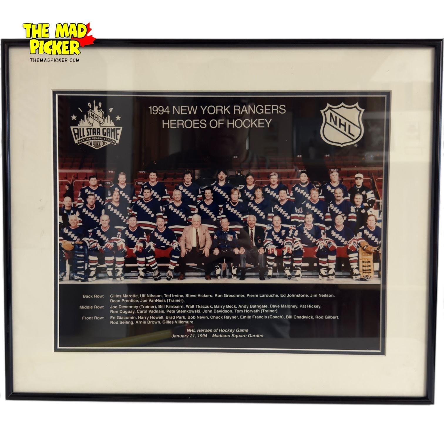 Framed 18x15.5 commemorative print from the Moments in Time Collection celebrating the 1994 New York Rangers Heroes of Hockey. This vintage piece honors the team’s storied legacy and features bold imagery capturing the excitement of Rangers history. Complete with Certificate of Authenticity, it is a rare and authentic collectible for hockey fans and memorabilia enthusiasts.