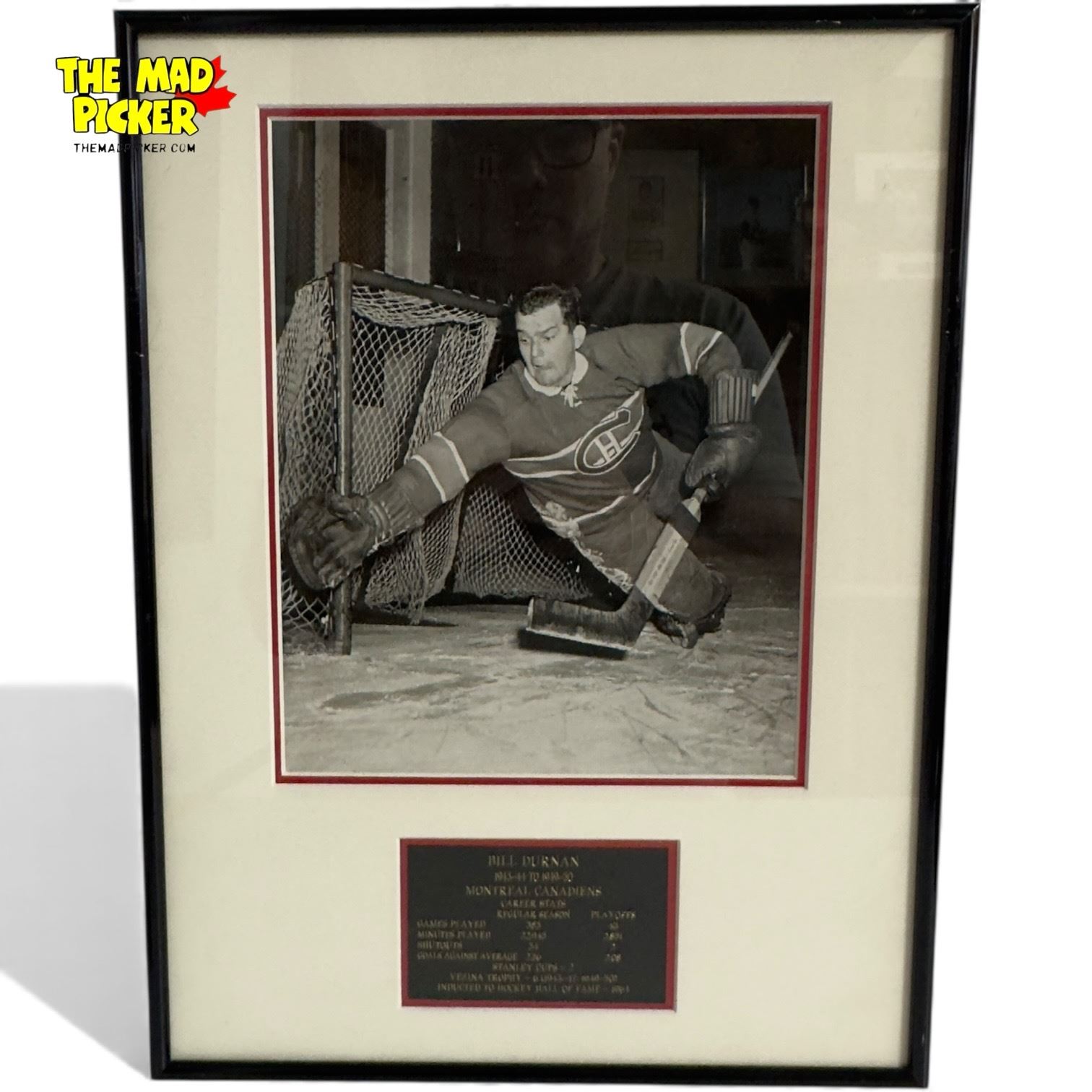 Framed 12x16.5 photo from the Moments in Time Collection featuring Montreal Canadiens Hall of Fame goaltender Bill Durnan. One of the most dominant goalies of his era, Durnan played seven NHL seasons, winning the Vezina Trophy six times and helping the Canadiens capture two Stanley Cups. Known for his ambidextrous style, he wore gloves that allowed him to switch hands instantly. Inducted into the Hockey Hall of Fame in 1964 and named one of the “100 Greatest NHL Players" in 2017, this piece includes a Certificate of Authenticity and is a rare collectible for hockey fans.