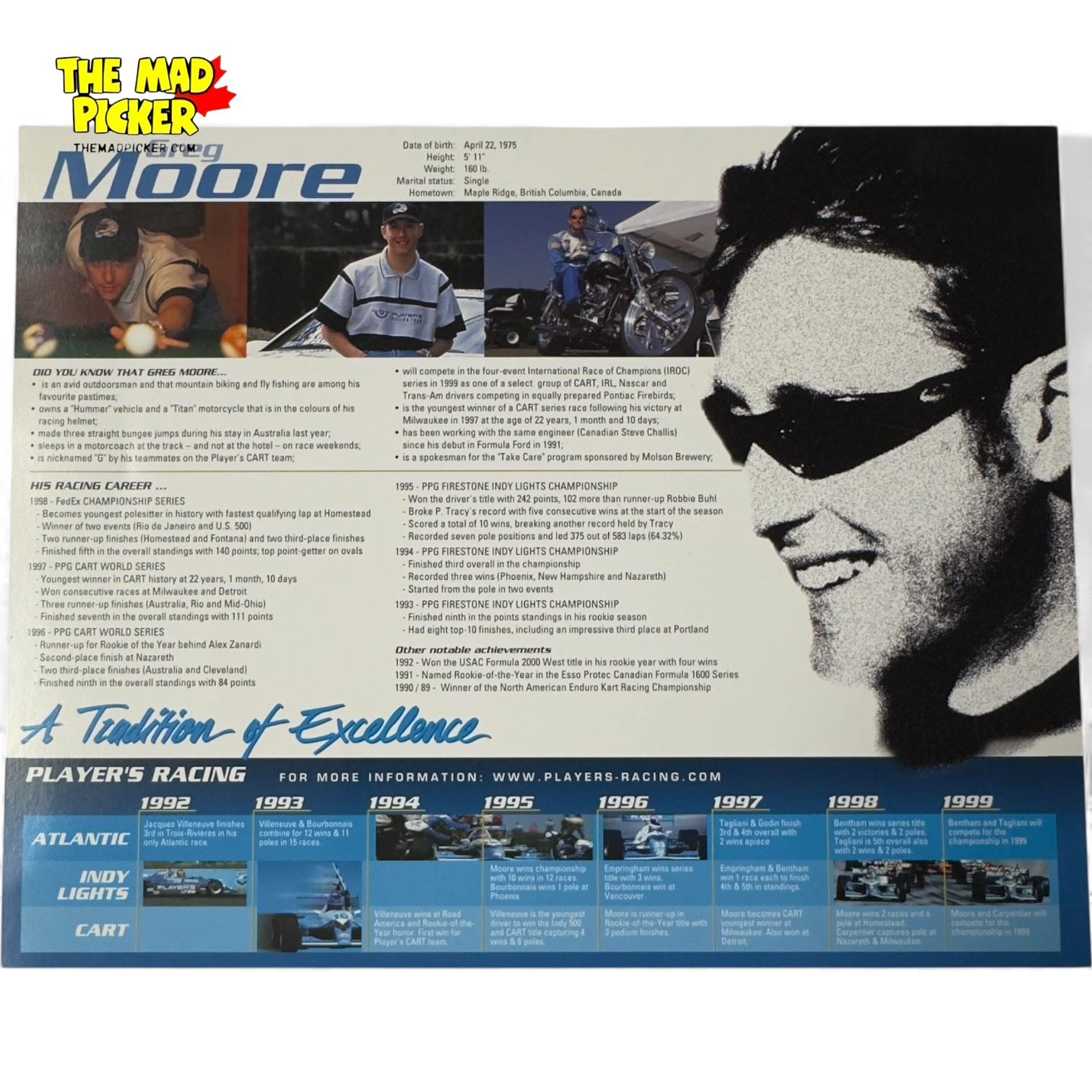 Autographed 1999 Players Forsythe Racing promotional card featuring Canadian IndyCar driver Greg Moore. The piece shows Moore with his racing car graphic and includes his signature across the image. Moore was one of Canada’s most promising motorsport talents, competing in the CART series until his tragic passing during the final race of the 1999 season. This collectible is a rare piece of racing memorabilia from the Moments in Time Collection, honoring Moore’s legacy and impact on the sport.