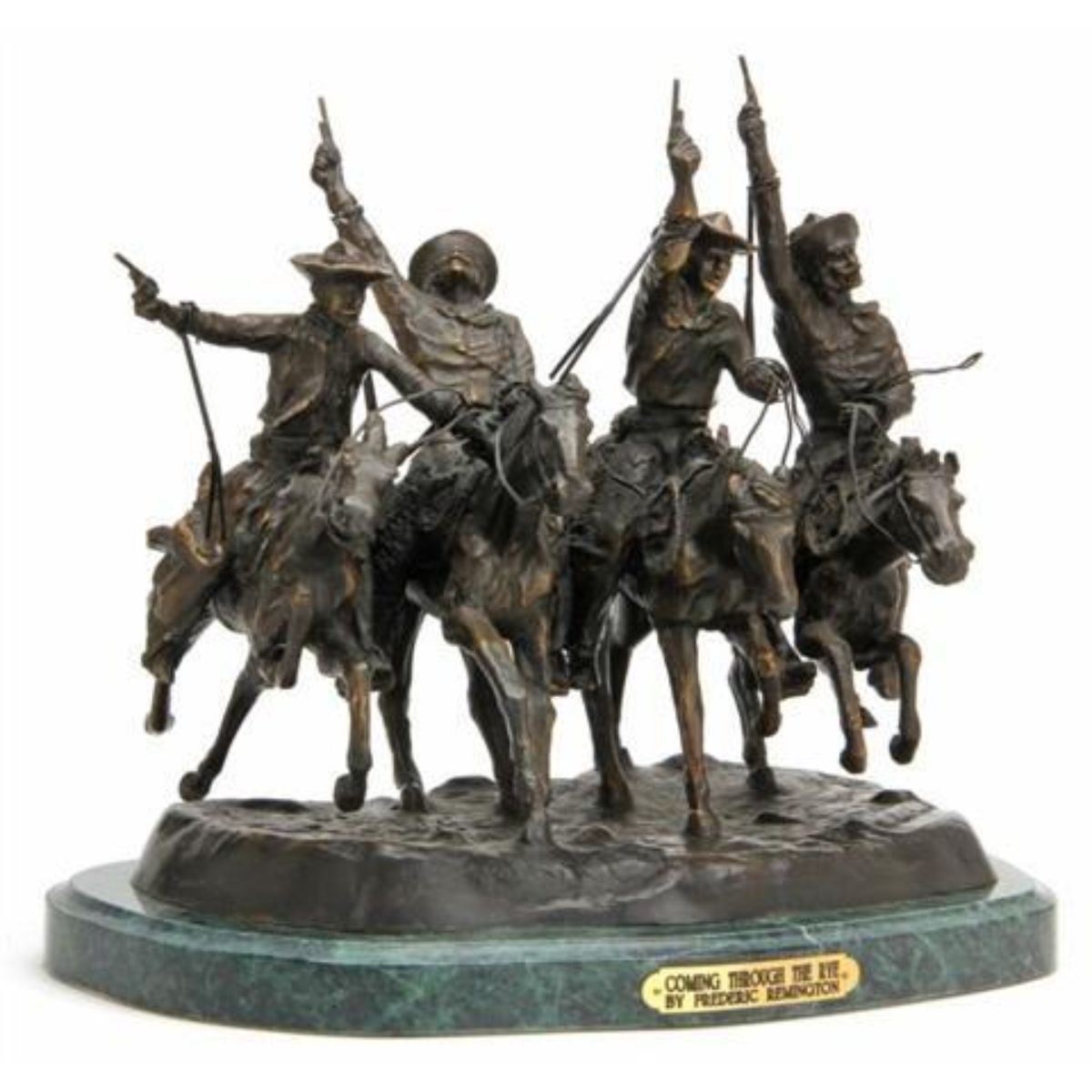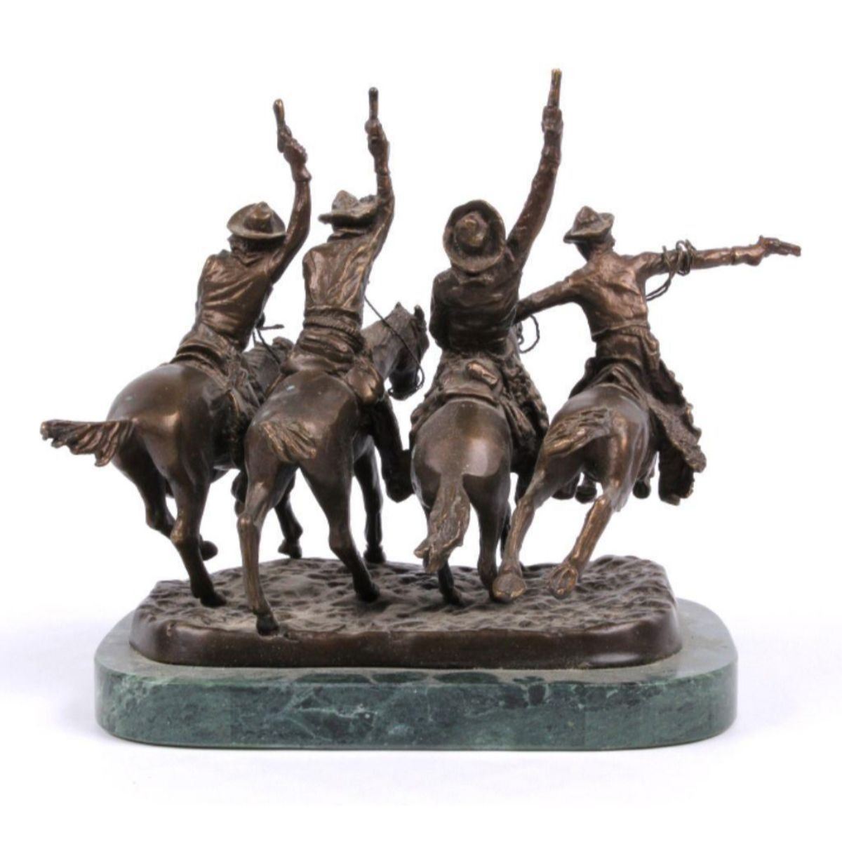 Regular 13 1/2" H x 15 1/2" L - This is not an original Frederic Remington sculpture for if it was, it would be worth a great fortune. This is a masterful lost-wax bronze molded sculpture masterfully recreated in the Frederic Remington style. There are many steps in this intricate process. If interested, you may read about this process here: https://en.wikipedia.org/wiki/Lost-wax_casting