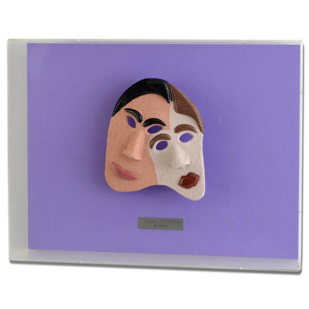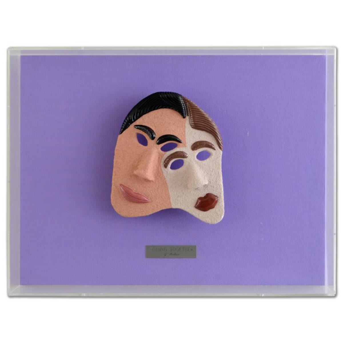 "Coming Together" is an original hand-made ceramic mask sculpture by George Marlowe! This piece comes suspended and encased in a custom-made Lucite display with signed metallic name plate. Includes Certificate of Authenticity. The box frame measures approx. 24.5" (width) x 18.5" (height), 5" (depth); 9lb (total weight). The mask measures approx. 8" (width) x 9" (height). Reference #: 213882