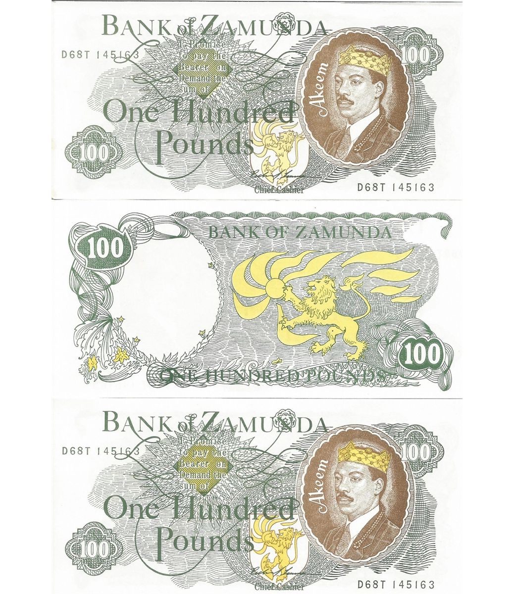 A pair of prop Zamuda bills showing Prince Akeem played by Eddie Murphy on the bills