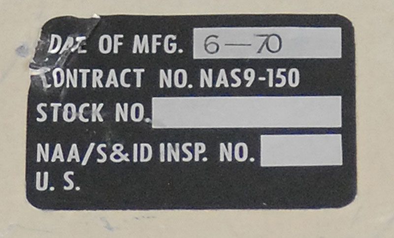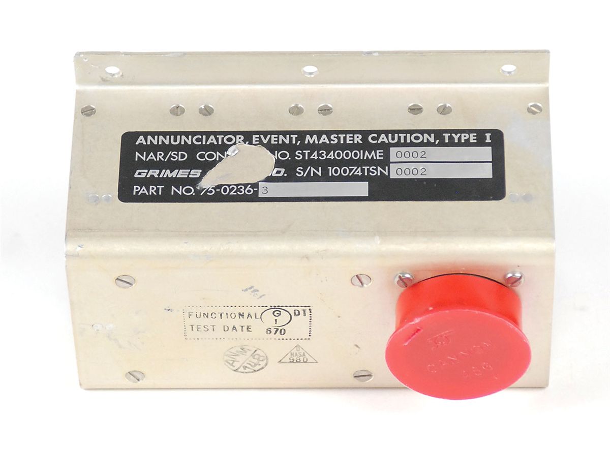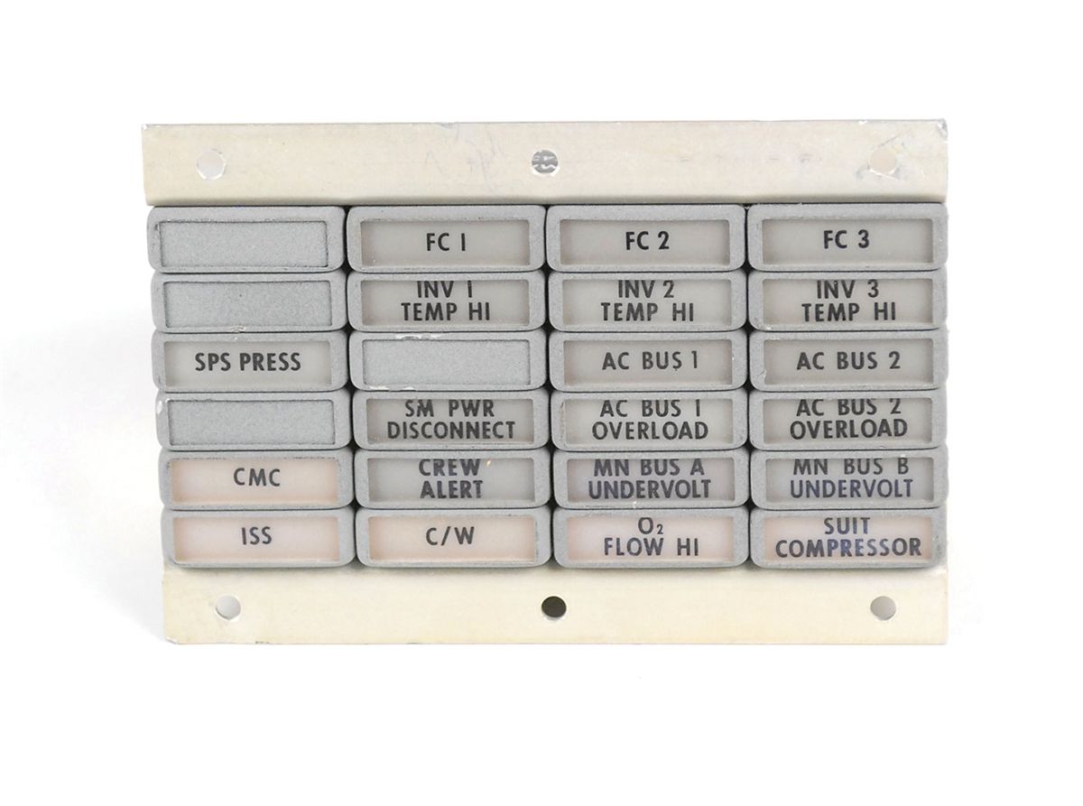 Apollo Command Module Block II annunciator caution panel. Production representative for flight application panel measures 5 x 3.5 x 2.25 with 24 indicators on the face, 20 of which are labeled. Indicators include Main Bus A and B Undervolts, AC Bus 1 and 2 Overloads, and Crew Alert. A Grimes parts label is affixed to one side and reads, in part: “Annunciator, Event, Master Caution, Type 1…S/N 10074TSN0002,” with a smaller label affixed to the opposite side which states the date of manufacture was June of 1970. In fine condition. This panel comprised the right bank of the Caution and Warning System lights that were found on Panel 2 of the Command Module.