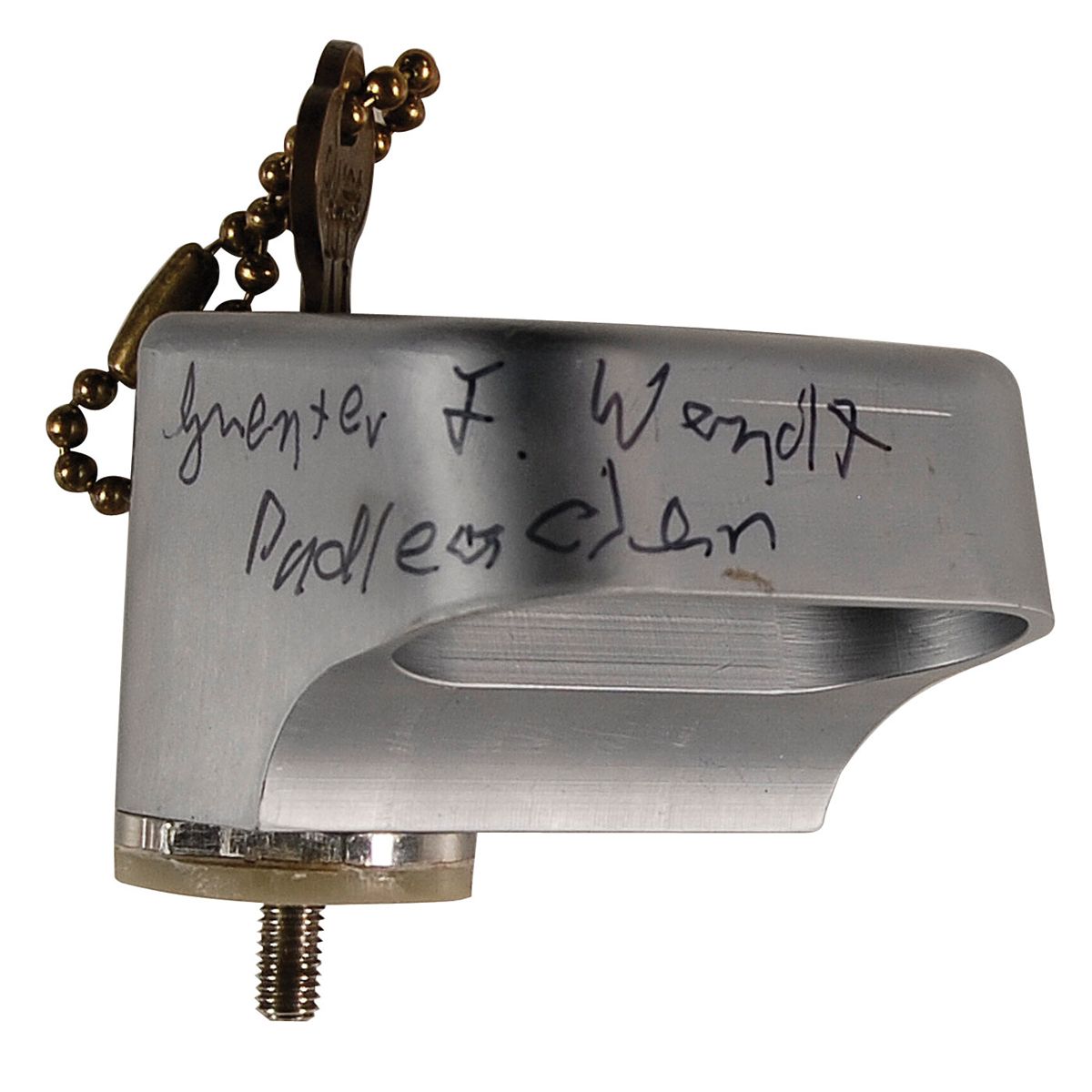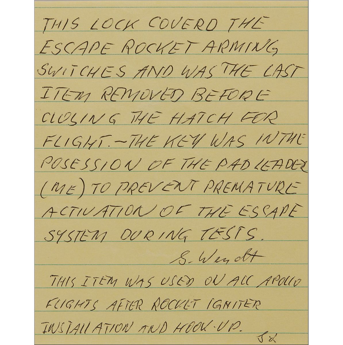 Mission-used Apollo Command Safety Module lock originally from the personal collection of Guenter Wendt. This heavy metal screw type lock and key, measures approximately 2 x 2, marked “ASSY V36-761903-103-67-NC,” and is signed on the side in black felt tip, “Guenter F. Wendt Padleader.” Accompanied by a handwritten letter of provenance from Wendt which reads, in full: “This lock covered the escape rocket arming switches and was the last item removed before closing the hatch for flight. The key was in the possession of the pad leader (me) to prevent premature activation of the escape system during tests. G. Wendt. This item was used on all Apollo flights after rocket igniter installation and hook-up.” Also accompanied by a photo of Wendt taken at time of signing.