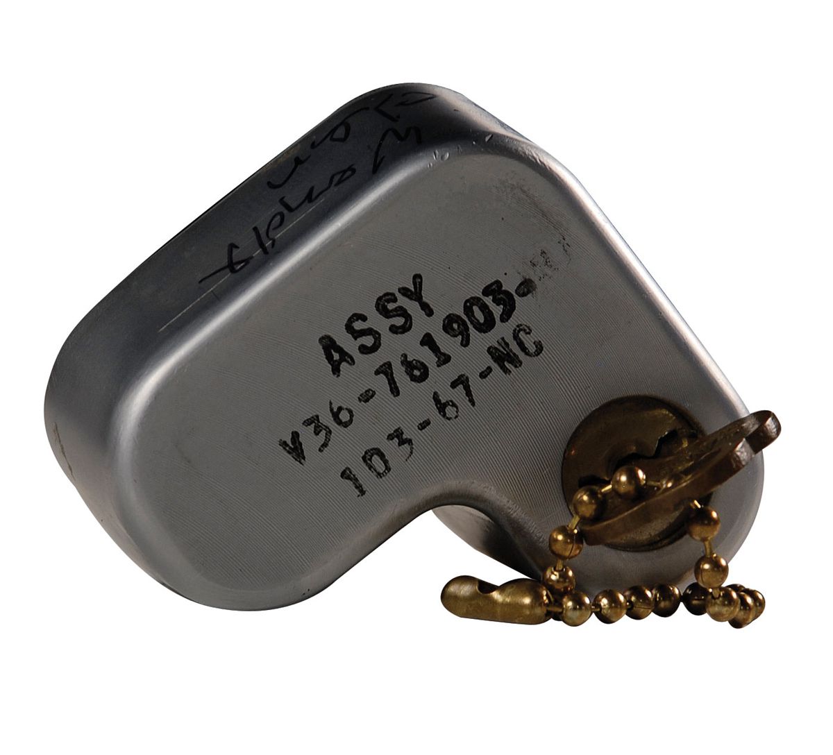This lock and key was used to protect the arming switches of the Launch Escape Tower. This lock covered the lever lock-type PYRO ARM switches A and B on Panel 8, to the left of the commander’s seat and safeguarded against accidental premature arming of the pyro busses of the escape system during tests. The escape booster was the last resort for emergency escape for the three crewman before, during, or shortly after lift-off.