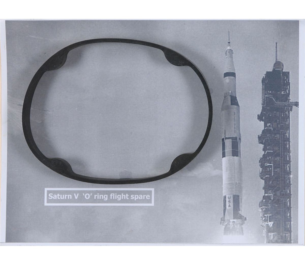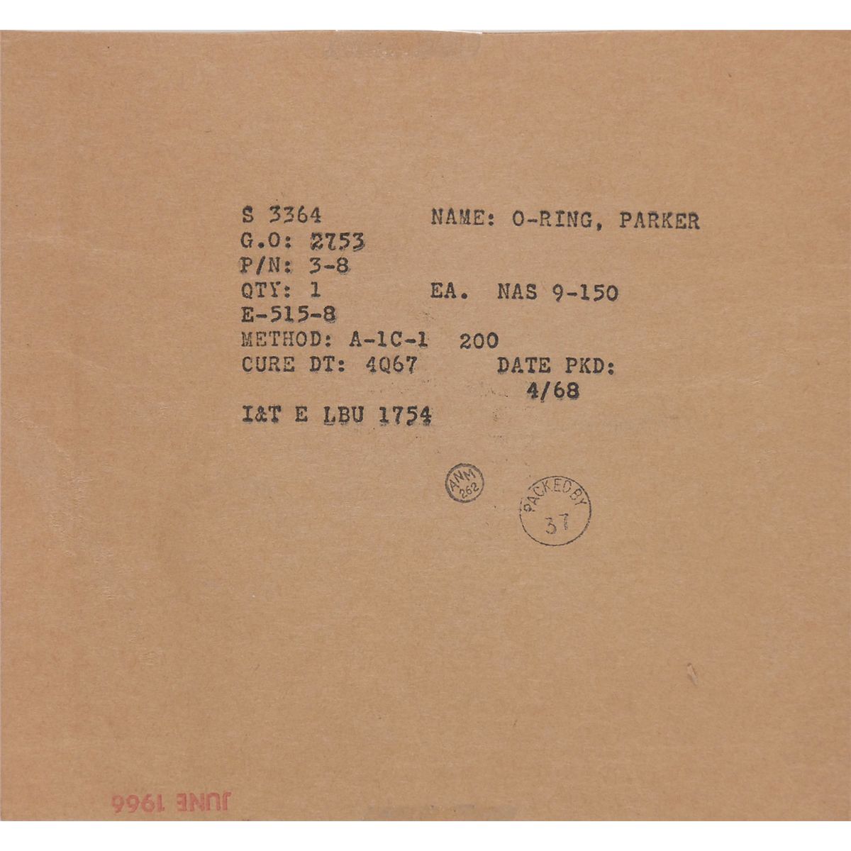Spare rubber O-ring for the Command Service Module, approximately 4.25? in diameter, affixed to a 7.75 x 5.75 cardstock display (incorrectly identifying it as a Saturn V rocket part). Affixed to the reverse is the original packing label, which identifies the part as “O-Ring, Parker,” with a packing date of April 1968. In fine condition.