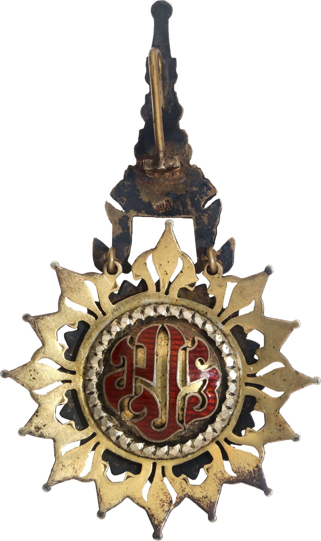 Medal, Thailand, Rama IX, Order of the White Elephant, Grand Cross Medal, Silver alloyed & enameled, 3rd type Commander Neck Badge, Obv: an eight-pointed Star with a single leaf in its each quadrant, central design composed of White enameled Elephant on gilt background, surrounded by a ring of facets and an exterior ring of red and green enameled petals, Thai crown suspension, Rev: red enameled cypher in the center with exterior rings, suspension to wear, 49.8g, 54.7x93.5mm, some scratches, about extremely fine, Very Rare.