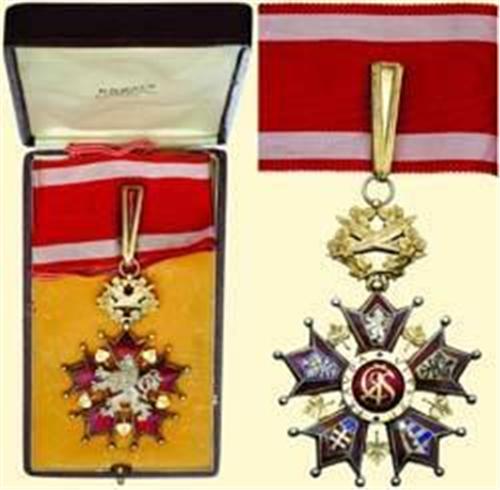 Commander's Cross for Civil (3rd Class) - I.Type; neck badge, silver gilt, partially enamelled, superimposed lion silver-grey frosted, wreath with palm branches and enamelled suspension loop with original ribbon, with box (Krétly, Paris). Enamel damage in centre under lion.