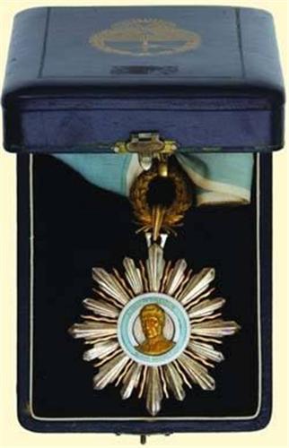 Commander's Cross; neck badge, multi-rayed silver and gold star, centre medallions partially enamelled, with gilt laurel wreath above and original suspension loop and ribbon, with original gold printed leather box of issue (JOYERIA RICCIARDI, BS. AIRES...). Very fine design and quality, but medallions and some rays are loose.