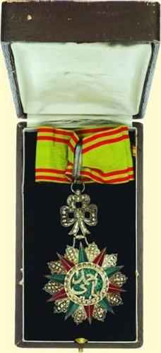 Commander's Decoration - Type Sidi Ahmed; neck badge, silver brilliant cut, partially red and green enamelled, superimposed rays, with ornament above and original suspension loop, with French hallmarks, maker's mark on reverse "ARTHUS BERTRAND, PARIS"; with original ribbon and original box of issue (A.Bertrand...). Very fine French quality with stylized cypher of Sidi Ahmed, small signs of wearing!