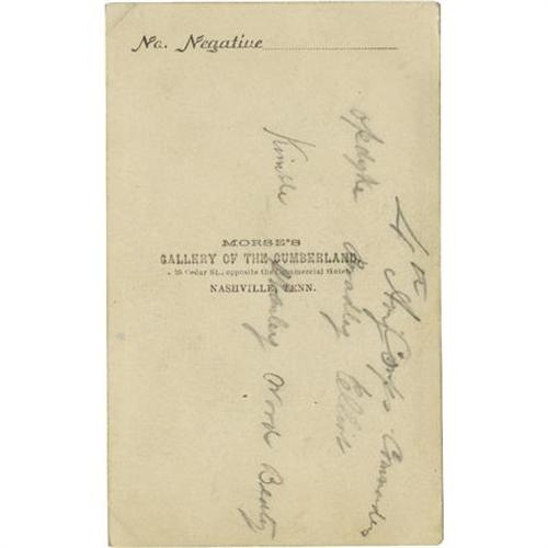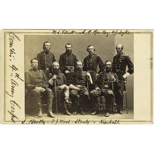 <B>Commanders of the 4th Army Corps <I>Carte de Visite</B></I>.</B></I> On October 9, 1863, the 4th Army Corps (Army of the Cumberland) was formed from many veteran fighting brigades. The division took part in numerous battles and campaigns, and saw many excellent officers in its control. Some of the major battles the unit was involved in were: Missionary Ridge, New Hope Church, the Siege of Atlanta, and the Occupation of Texas. In this photograph eight division officers are pictured. From right to left, starting with the seated row: Samuel Beatty, Thomas J. Wood, David Stanley, Nathan Kimball. Standing: W.S. Elliot, unidentified, S.B. Bradley, Emerson Opdyke. All in full uniform, wearing double-breasted coats, and several wearing cavalry boots. An excellent photograph of one of the Union's most rugged and distinguished units. In very fine condition; Morse's Gallery of the Cumberland imprint on verso; pencil notations on verso; ink notations on recto; image very clean and crisp; double lined gilt border; square corners.<BR><BR><b>Shipping:</b> Small Flat (<a target="_blank" href="http://www.heritageauctions.com/common/shipping.php">view shipping information</a>)