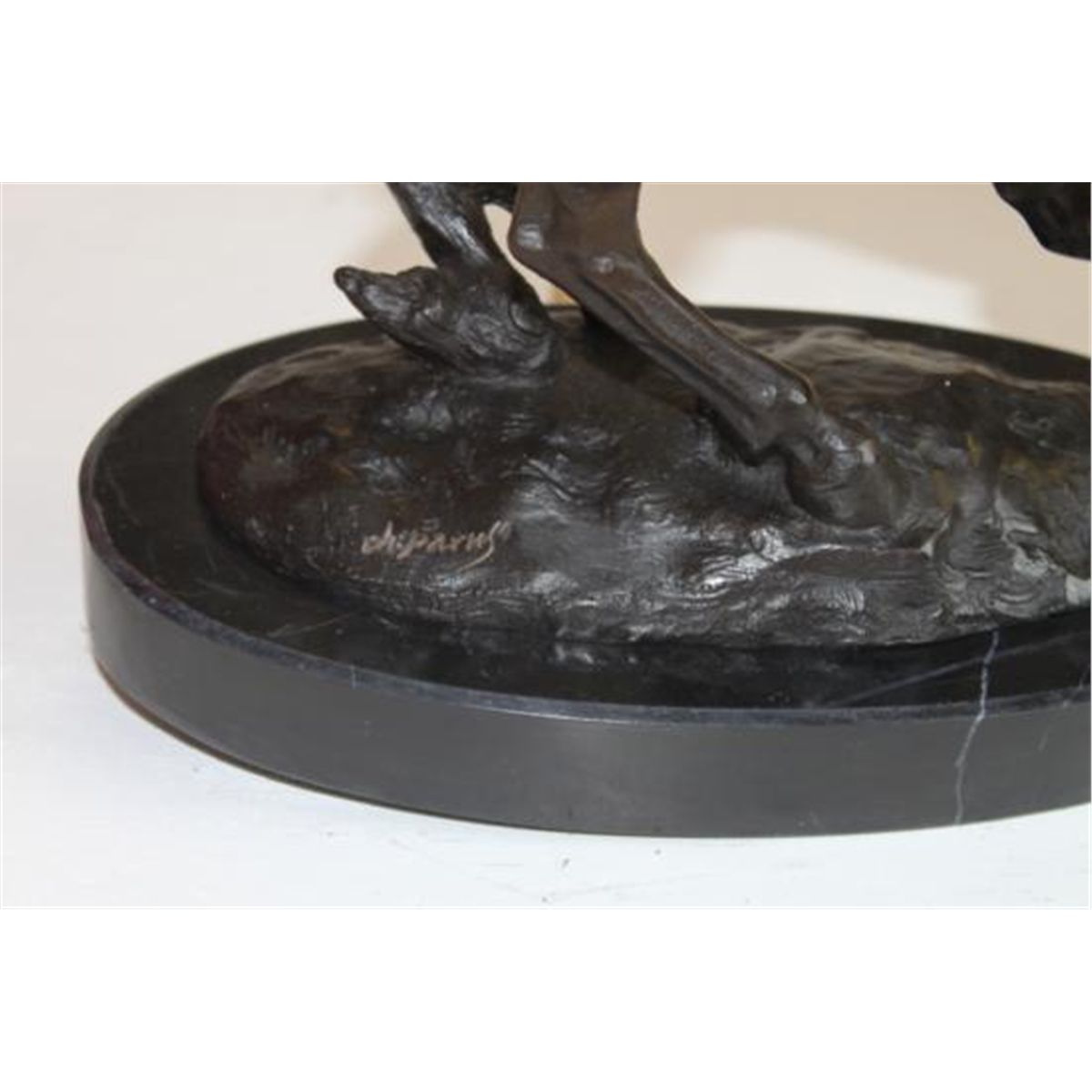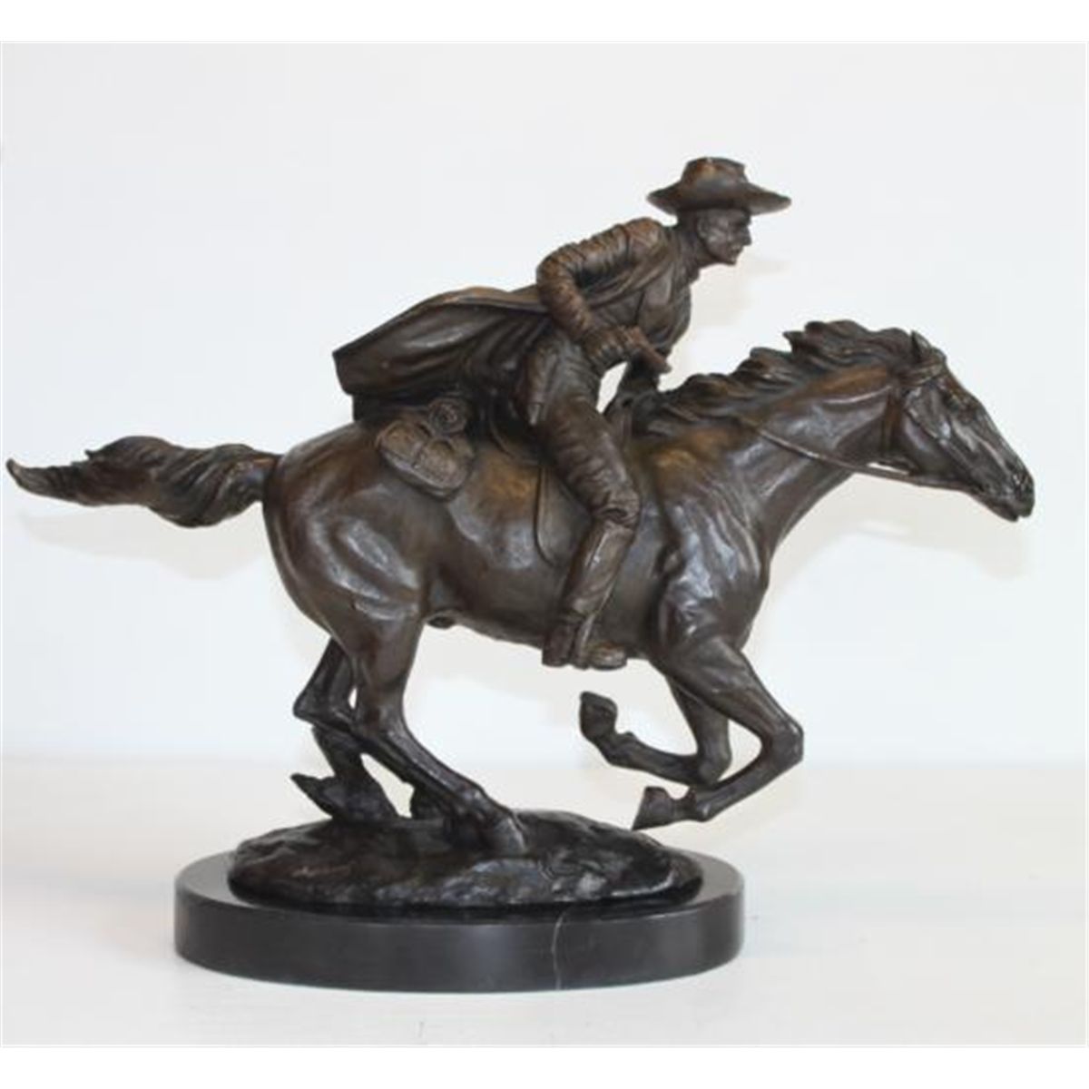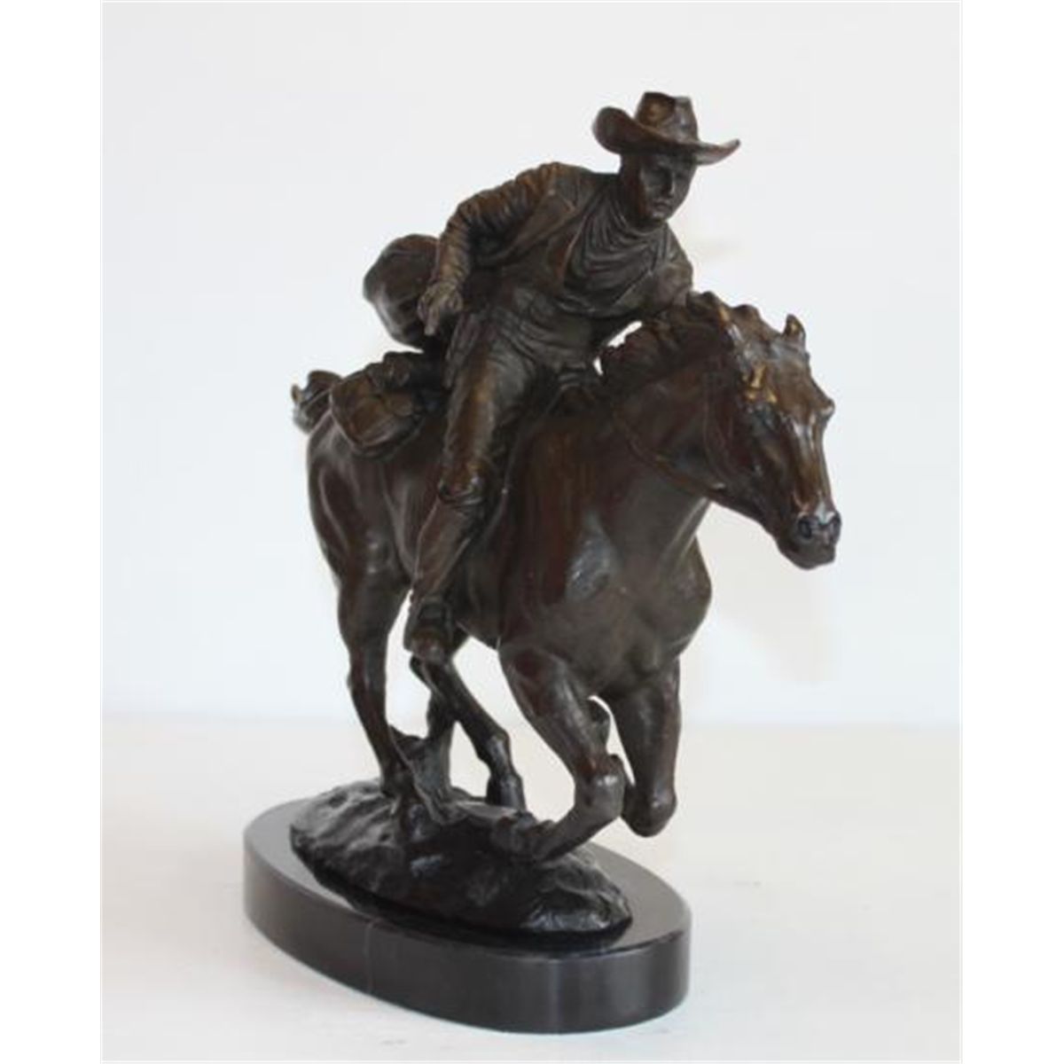 Western Cowboy and Horse, Bronze Sculpture, After Chiparus, 13"H x19"W x 6"D 26 lbs This bronze sculpture was produced using the "Lost Wax" casting method. The"Lost Wax" Cast method is the most precise metal casting technique in existence, ensuring exquisite detail of the original host model which is usually sculpted in clay or wax. This "Lost Wax" casting method is an extremely labor intensive and expensive process, but the end results produce a Heirloom Quality Masterpiece!