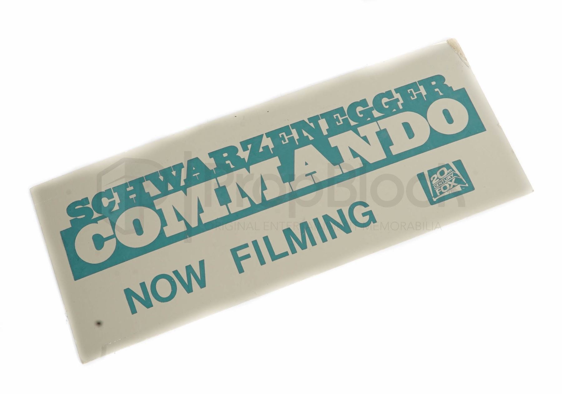Crew placard used in the production of the 1985 Arnold Schwarzenegger film Commando. A retired Special Forces colonel tries to save his daughter, who was abducted by his former subordinate. This piece is made of cardboard and features the films logo on the front in green ink. This item remains in excellent, production used condition.