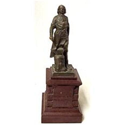 This small bronze of Peter the Great is dated 15 February 1912 and celebrates the 200th anniversary of the founding of the Imperial Arms Foundry in Tula by Peter the Great in 1712. The base is a red-brown gutta percha-the same material used in photocases in the late Victorian period. Peter is depicted as a Vulcan, in this fascinating little bronze, which is a small version of a life-size statue in Tula erected in 1912. The bronze measures 4 1/8" in height and including the plinth, 7 1/2". It is in excellent condition, and is a true relic of Imperial Russia, dating just prior to WWI.