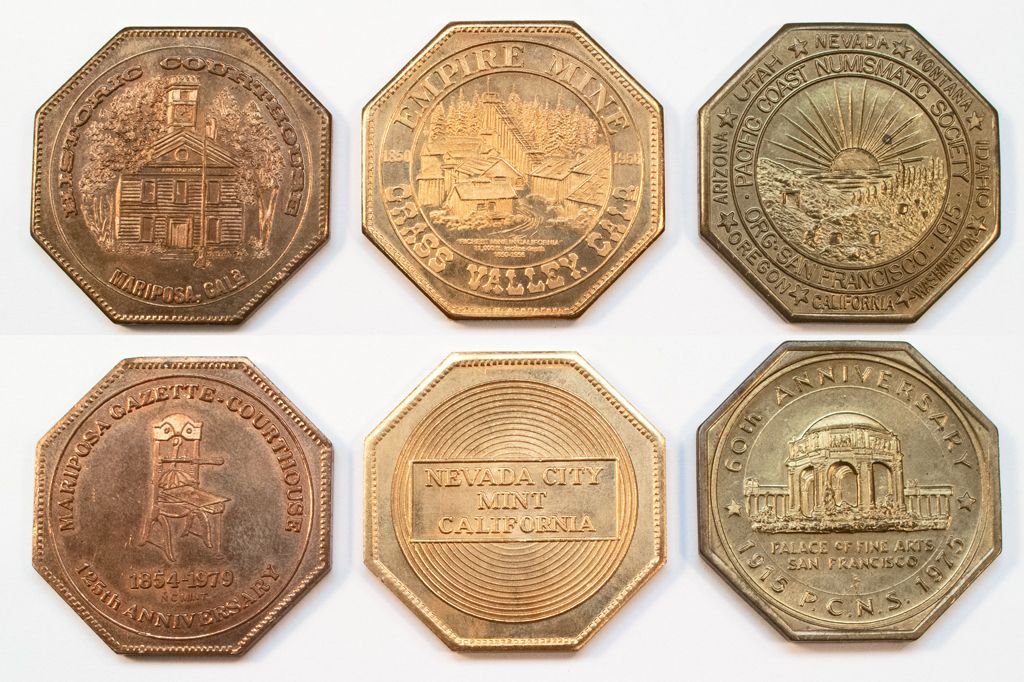 Lot of 3 So Called Dollars: 1956 - Empire Mine Grass Valley CA Reverse-NEVADA CITY MINT CALIFORNIA; 1975 60th Anniversary Palace of Fine Arts PACIFIC COAST NUMISMATIC SOCIETY, rare-100 made; 1979 Mariposa Gazette-Courthouse 125th Anniversary