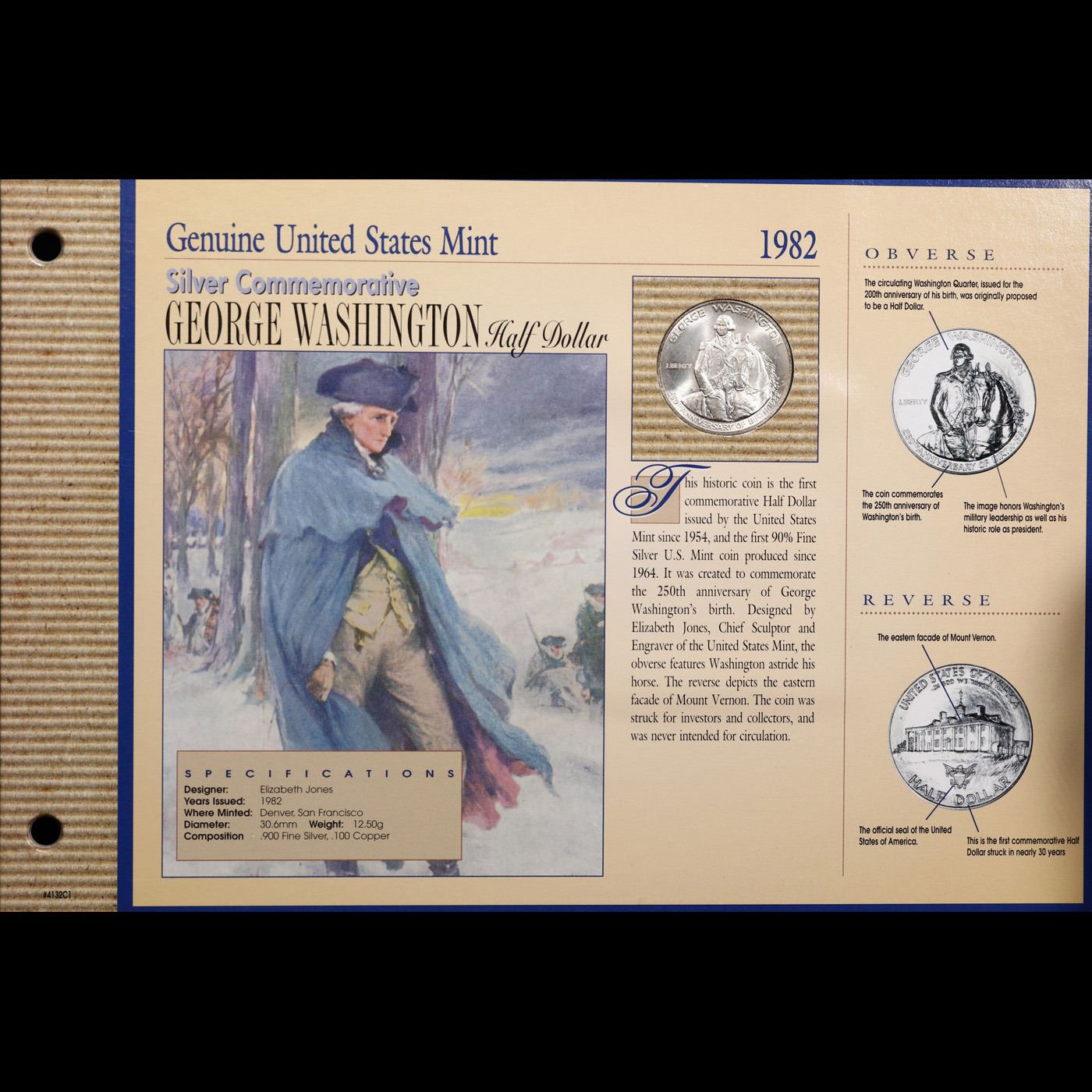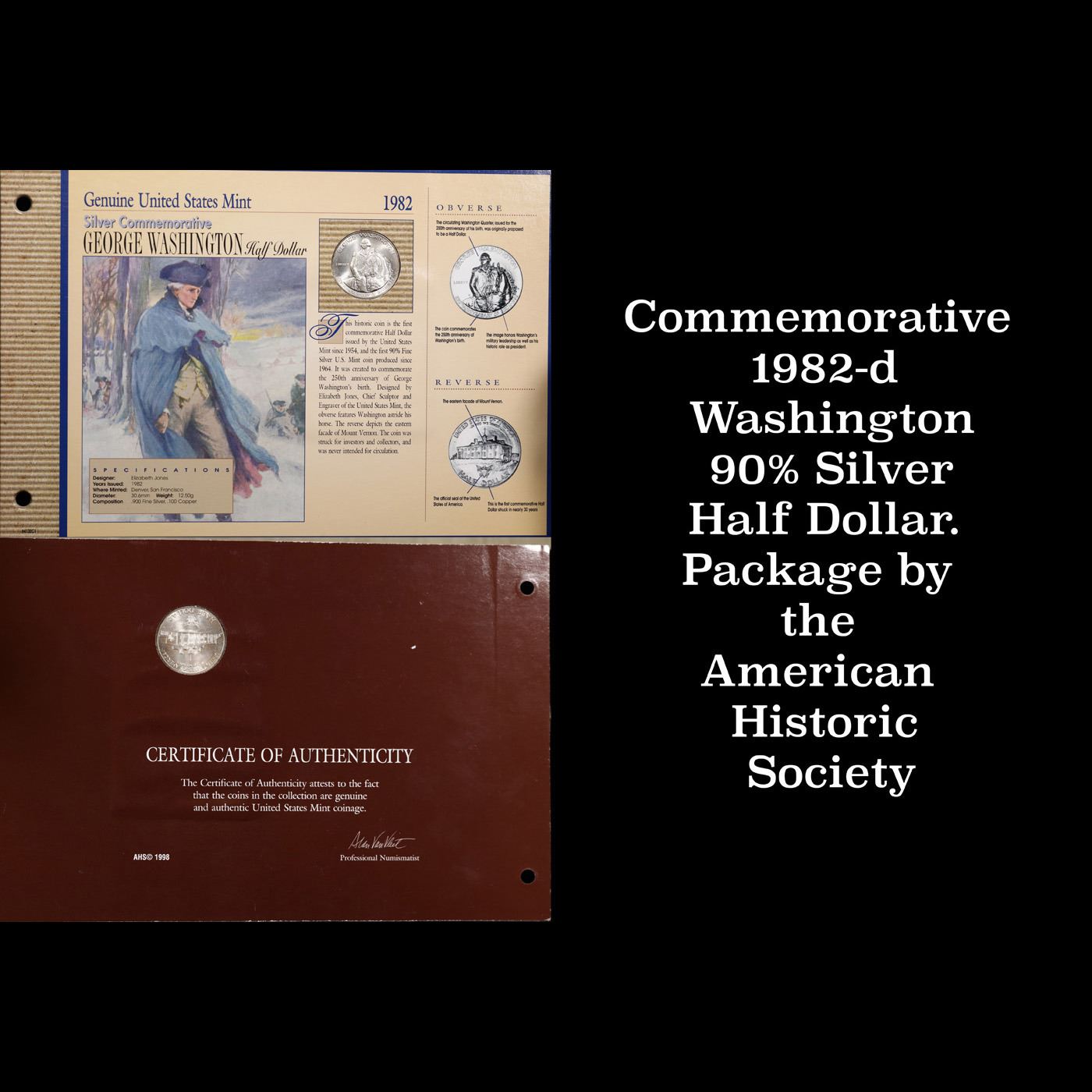 Commemorative 1982-d Washington 90% Silver Half Dollar. Package by the American Historic Society. Mo