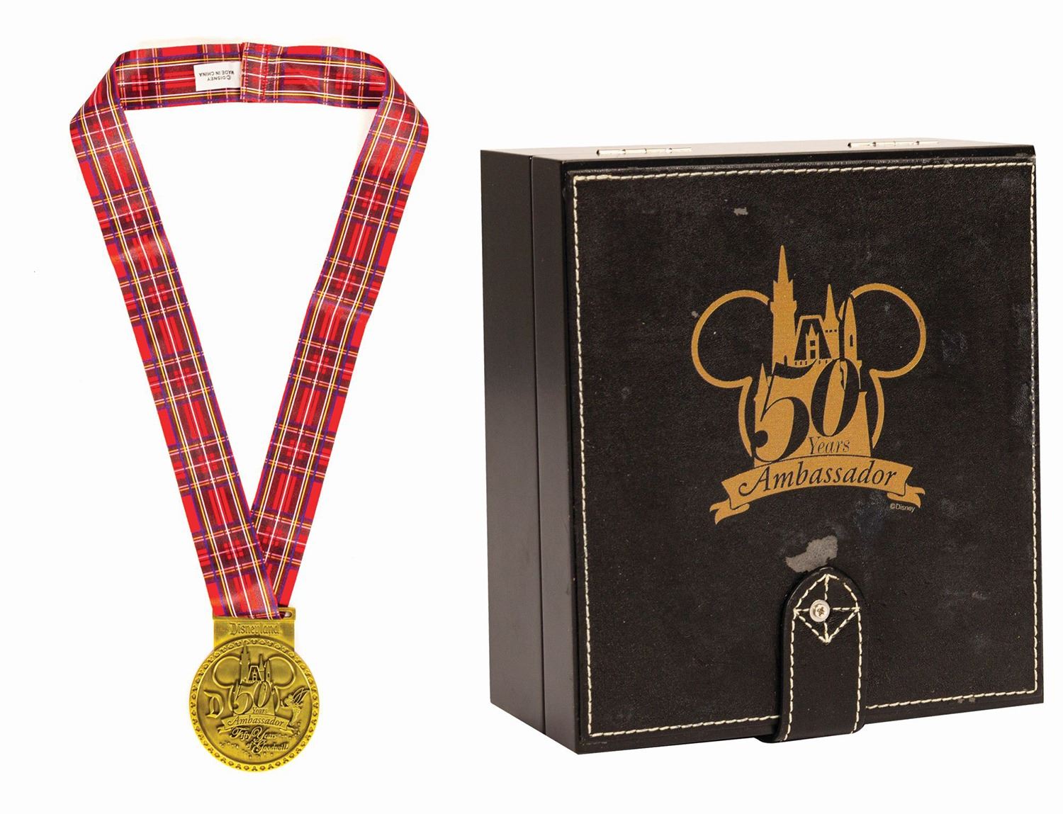 (Disneyland, 2015) A commemorative 50 year Ambassador medal from Disneyland. In 2015 a medal was given to Julie Reihm Casaletto, who was the first Disney Ambassador to be chosen. This medal was given in celebration of the 50th year of the program, an incredible milestone for Walt Disney. The medal comes in a box that measures 6.5"x5.5" and is 2.75" tall. The item is in fine condition.