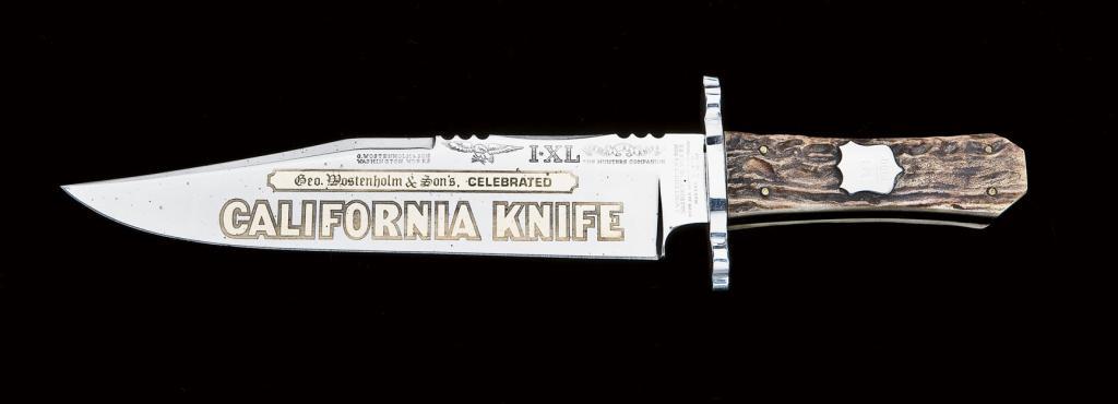 Commemorative Bowie Knife by George Wostenholm and son, Washington Works. Showing plaque in grip “323 of 1000”. The blade mounts are silver plated with gold gilt decorations showing California Knife and other 19th century style motifs. Stag grips, fine to excellent condition. Made 1960’s to early 1970’s. From the Hugh Hayes Collection. Est: $400 - $800