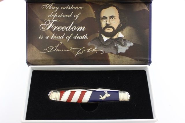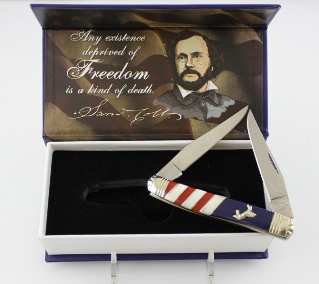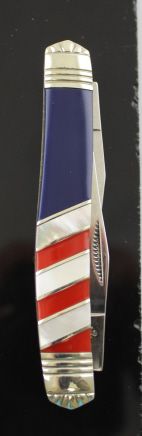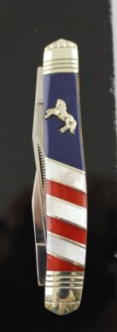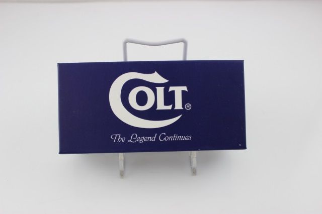 Custom series Colt Commemorative Pocket Knife. Muskrat 2 blade folding knife shows its beauty with Blue & Red handles with White Mother of Pearl Inlays. This quality folder measures 3 7/8" closed. Box is in perfect shape with no damage. Perfect for the colt collector!