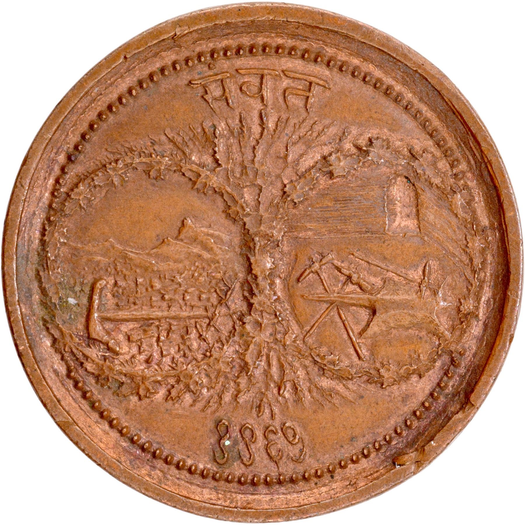 Medal, Baroda State, Amreli Agricultural and Industrial Exhibition, CopperMedal, Samvat 1967/1910 AD,Obv:ploughing field with necessarymaterials, mountains,tree, ahouse in background, samvat date below, beaded border around the field,Rev:circular shapedfloral wreath in the center, Nagari legend aroundkhetiwadi ka hunar udyog/pradarshan/amreli in the field,floral border around the field,30.77g, 36.02mm,(Unlisted and Unpublished),about extremely fine,ExtremelyRare.
