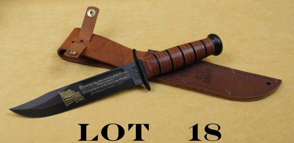 Commemorative KA-BAR military style knife and leather sheath in like new condition in factory two-piece box with inscription on blade “I took this flag down in honor of my Country. I am a veteran. I’m not going to see this done to my Country. Jim Brossard, October 3, 2007”. Jim Brossard made news in 2007 when he took down a Mexican flag in his home town that was being flown above an American flag at a local business. Est.:$75-$125.
