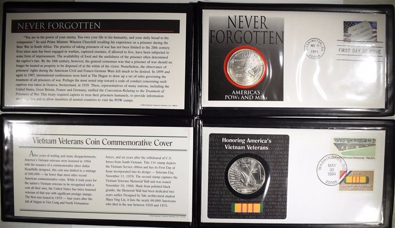Commemorative Lots - 1991 Clad Mount Rushmore Half Dollar, 2001 U.S. Capitol Unc Silver Dollar, 1992 Columbus Clad Half Dollar (all in capsules only, not boxes), 1994 W Vietnam Memorial Unc Silver Dollar with Information