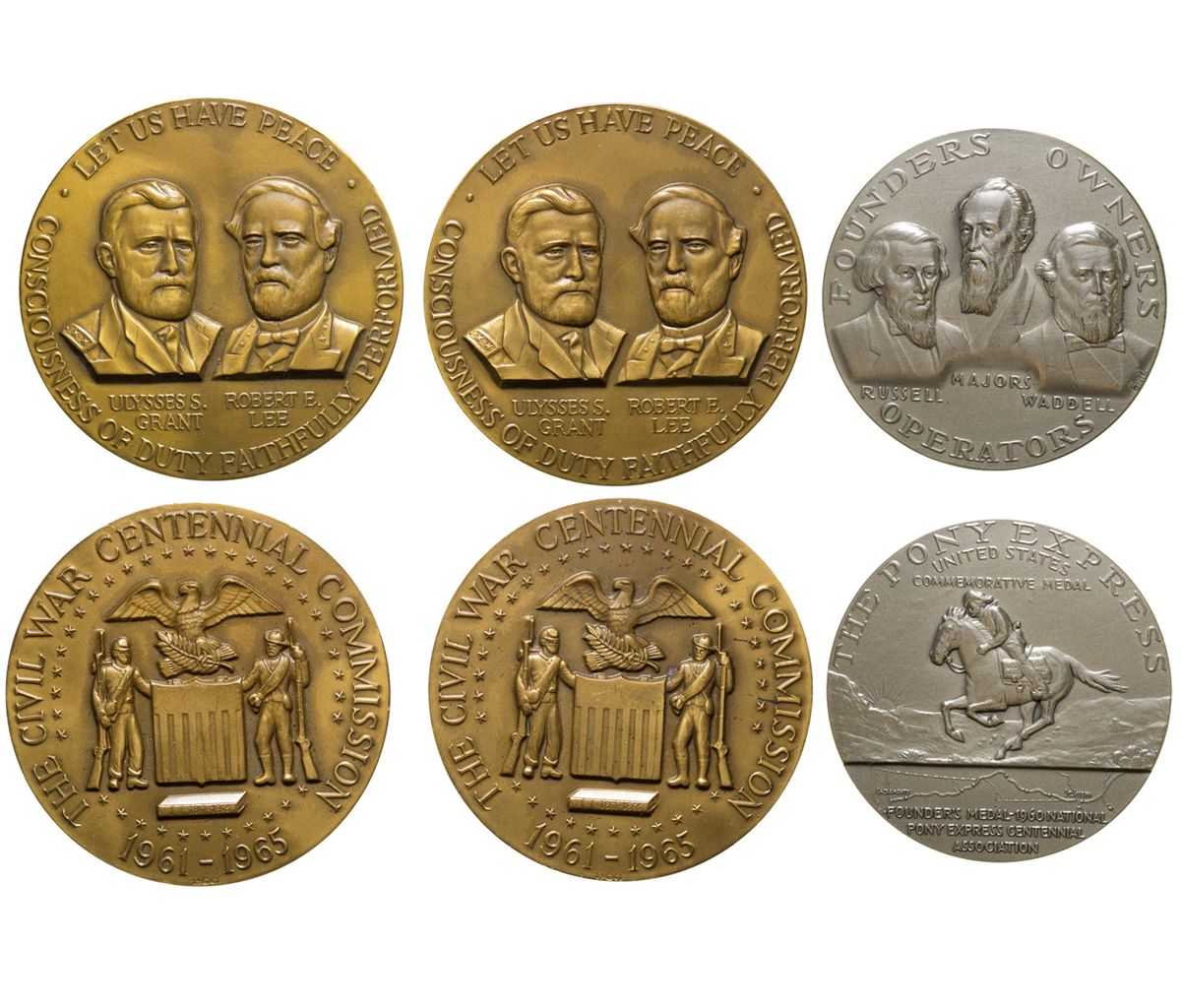 Lot of 3: 1) A Silver Founder's Medal of the National Pony Express Centennial Association, number 372 of 3000. Still in its original packaging, this 57mm silver medal weighs approximately 4.25 troy ounces. Obv.: "Founder's Owners/ Russell Majors Waddell/ Operator". Rev.: "The Pony Express/ United States/ Commemorative Medal/ Founder's Medal-1960 National/ Pony Express Centennial/ Association". 2) Two matching 63mm, 4.28 troy ounces bronze medals Obv.: "Let Us Have Peace/ Ulysses S. Grant Robert E. Lee/ Consciousness of Duty Faithfully Performed". Rev.: "The Civil War Centennial Commission/ 1961-1965". -61018