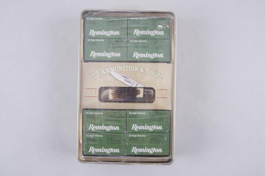 Commemorative Remington Knife Set & AmmoIncludes (8) 50-round boxes of 22 Long Rifle High Velocity ammo. Shrink wrapped in tin box.