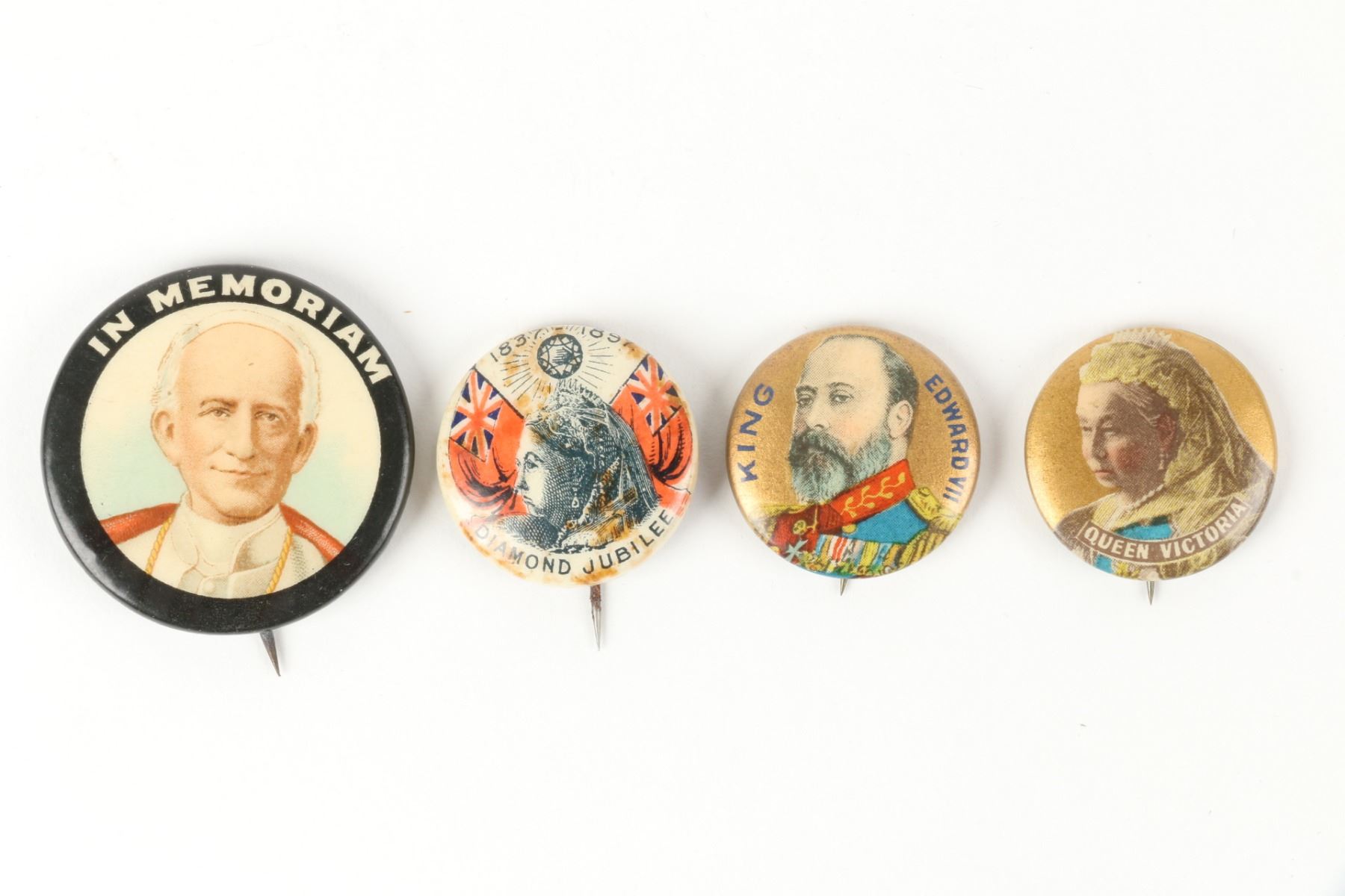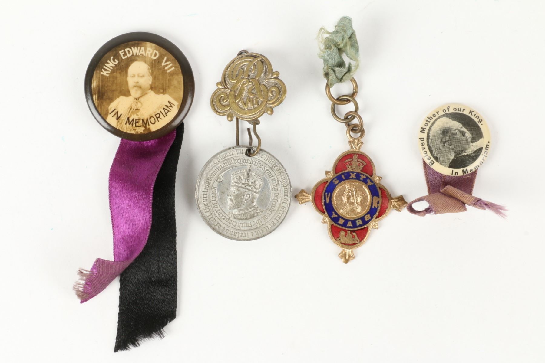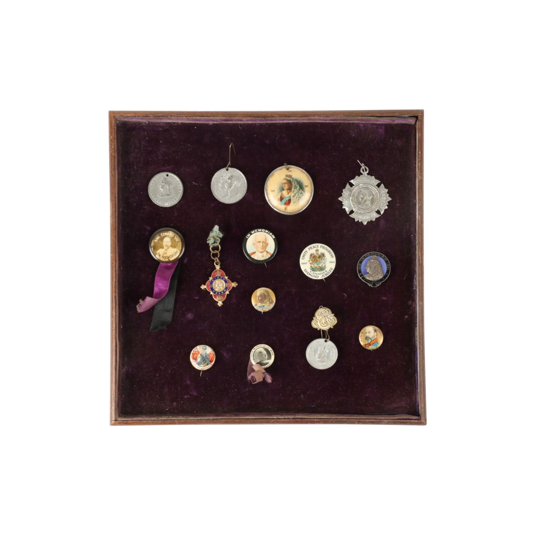 Fourteen (14) items. Eight (8) pinbacks, six (6) medals. Many Queen Victoria and King Edward. Includes in memoriam, jubilee, and coronation. Dating mostly to the turn-of-the-century. .75" to 1.25". Complete original condition. $200-300.
