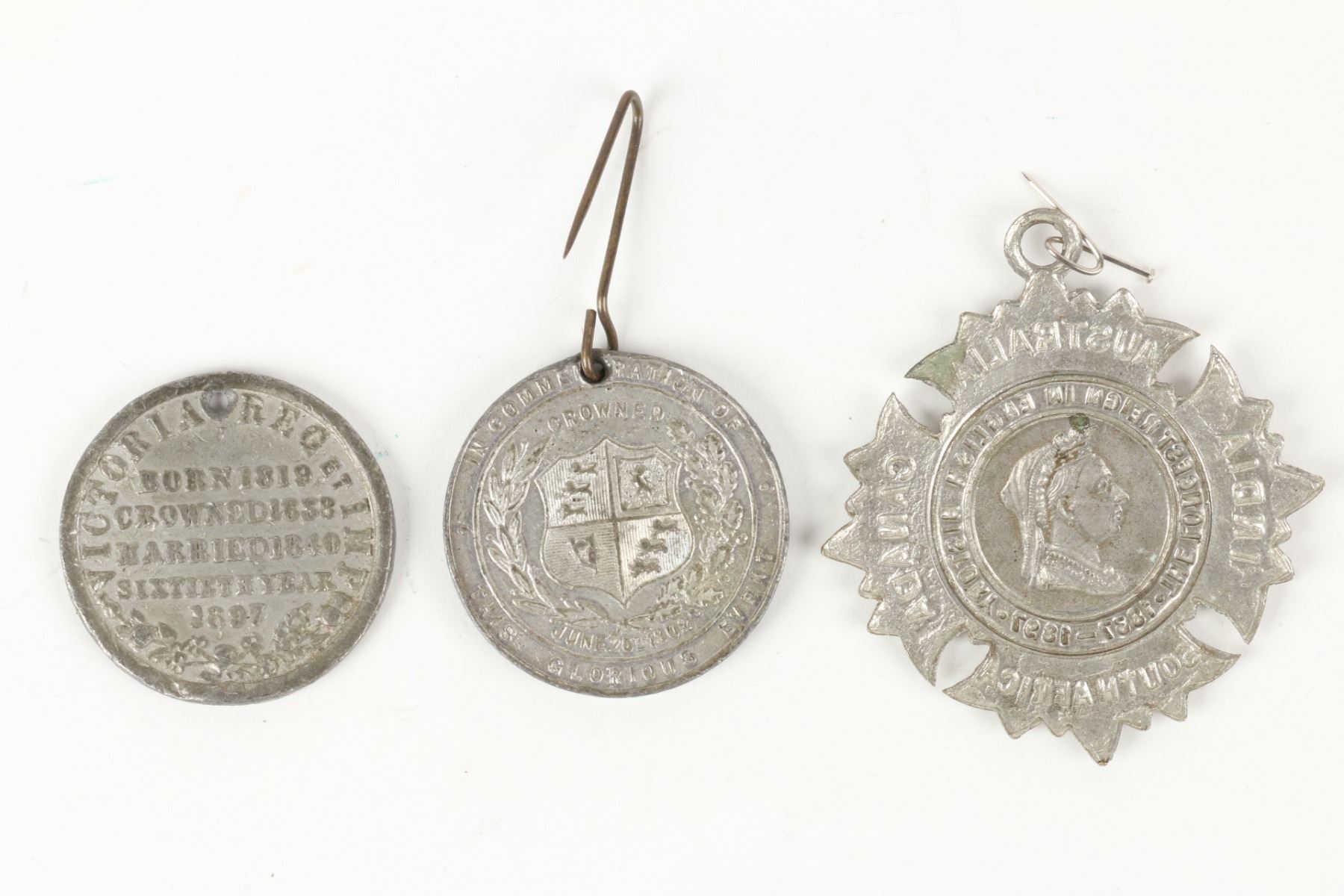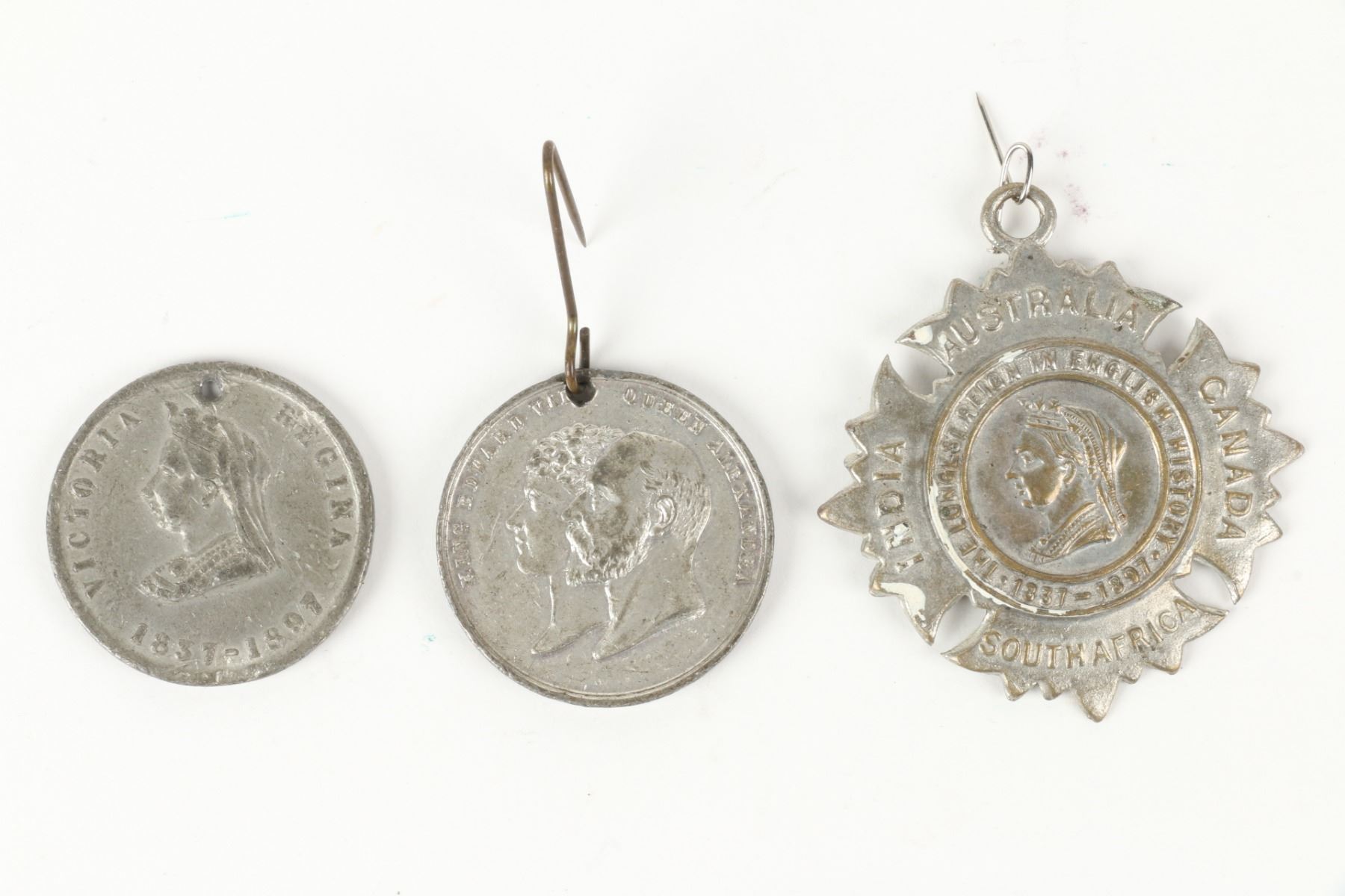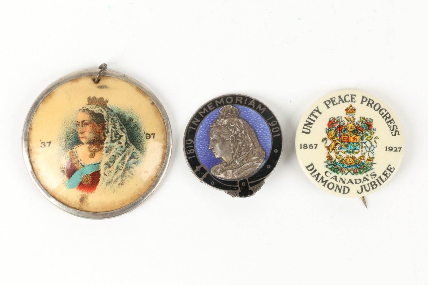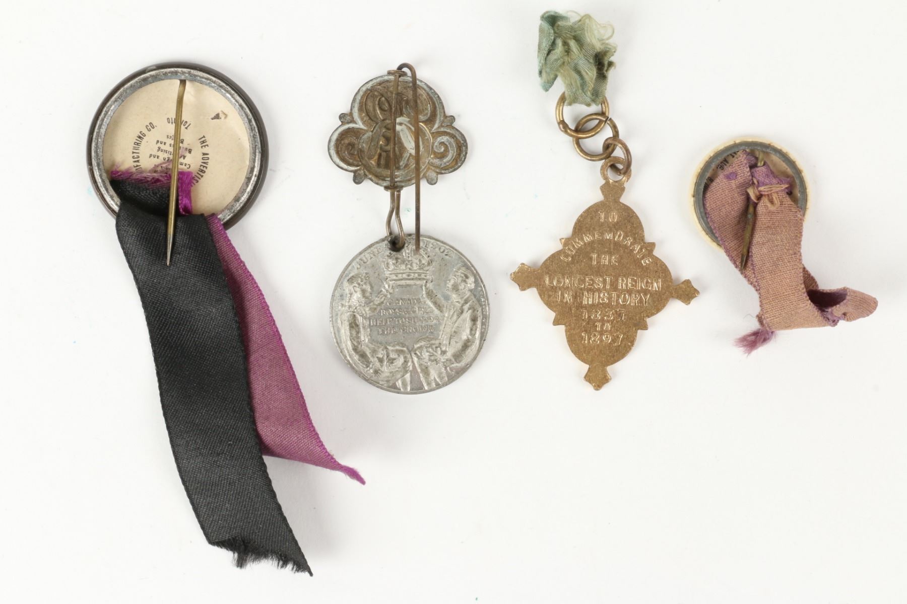 Fourteen (14) items. Eight (8) pinbacks, six (6) medals. Many Queen Victoria and King Edward. Includes in memoriam, jubilee, and coronation. Dating mostly to the turn-of-the-century. .75" to 1.25". Complete original condition. $200-300.