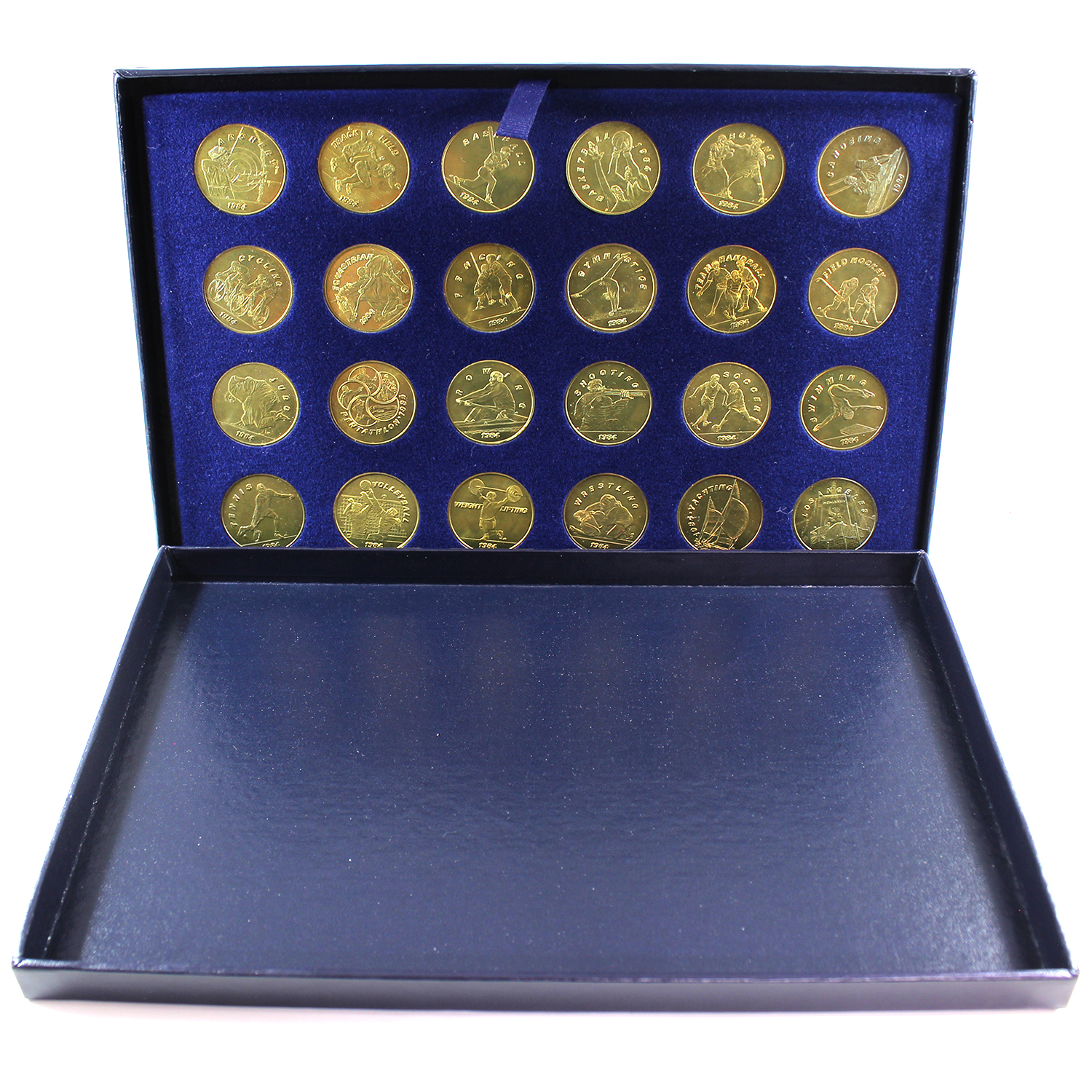 This commemorative set of transit fare tokens was created for the Southern California rapid transit district in cooperation with the Los Angeles Olympic Organizing Committee, for use during the 1984 Olympic year. Wear to case.