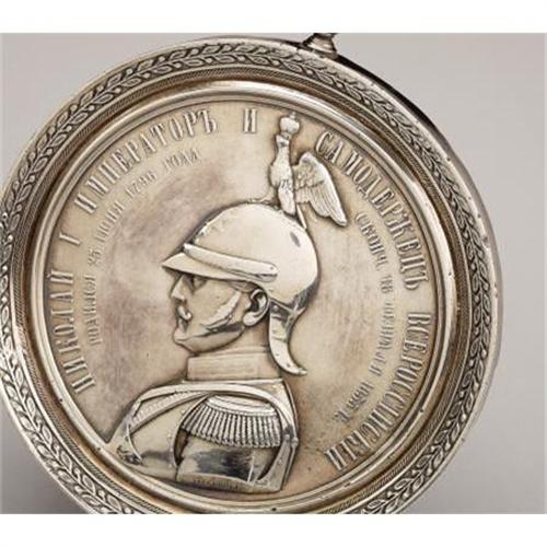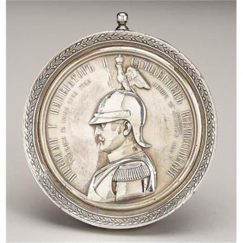 <B>Imperial Russian Emperor Nicholas I Commemorative Silver Table Medal</B></I><BR><I>Stamped Moscow, 1908-17</B></I><BR><BR>The bust of the Tsar facing left wearing uniform and helmet of the Imperial Horse Guards after a portrait by <BR>P. Brusnitzin, 1859, surrounded by Russian inscription: <I>Nicholas I, Emperor and Autocrat of All the Russias, Born 23 June 1796, Died 18 February 1855</B></I>,<I> </B></I>within a raised laurel leaf border, framed, with ring for outer suspension ring-4 in. diam. with leather backing<BR><I><BR>Nicholas I (1796-1855)</B></I><BR><BR>If his older brother, Tsar Alexander I, reflected the temperament of his grandmother, Catherine the Great, Nicholas I bore the imprint of their stern father, Paul I. Having acceded to the throne during the turmoil of the Decembrist Revolt of 1825, Nicholas ruled his empire with an iron hand. Born with a soldierly temperament, the Emperor was literally heartbroken by his beloved army's humiliating defeat in the Crimea, and he died in 1855, not long before the war's end. <BR><BR><BR><BR><b>Shipping:</b> Requires 3rd Party Shipping (<a target="_blank" href="http://www.heritageauctions.com/common/shipping.php">view shipping information</a>)