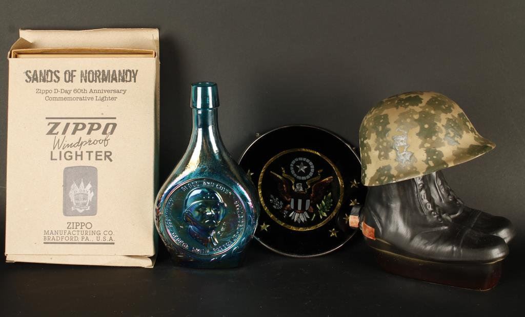 Commemorative U.S. Army lot including a boots and helmet decanter; a General Patton multi-colored bottle; a U.S. Army stained glass display piece with chain and a Sands of Normandy Zippo lighter in box commemorating the 60th Anniversary of D-Day. Est.: $75-$150.