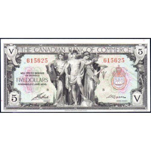 Canadian Bank of Commerce Five Dollars 1935, Aird-Logan, CH 75-18-02, Serial Number 615625 B, AU. Off centre toward the bottom