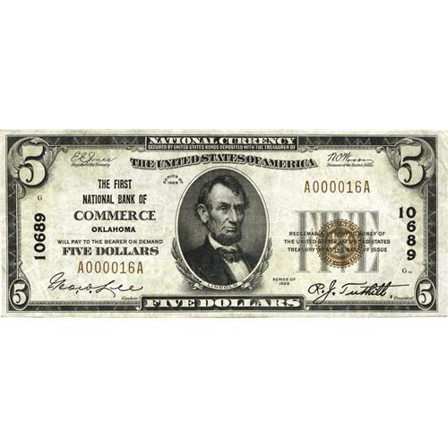 <B>Commerce, OK</B></I> - $5 1929 Ty. 1 <B>The First NB</B></I> Ch. # 10689<BR>This was the only issuer in this otherwise unremarkable small town, whose only claim to fame was being the home town of Yankee's slugger Mickey Mantle. Just eight serial 1929 examples are listed in the census, with this as nice as any. Bright <B>Very Fine.</B></I>