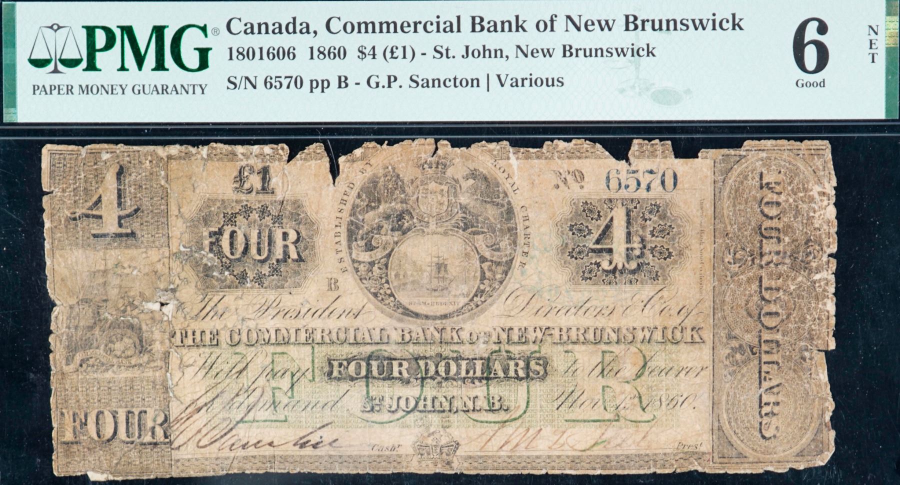 Commercial Bank of New Brunswick 1860 $4 #6570 CH-180-16-06 PMG Good-6. Rare and seldom offered.