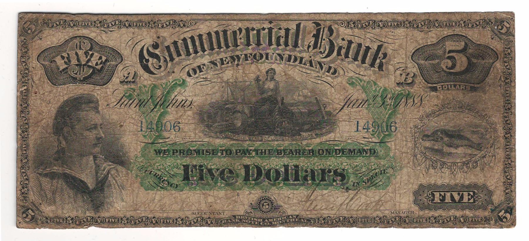 Commercial Bank of Newfoundland 1888 $5 185-18-06 About Fine