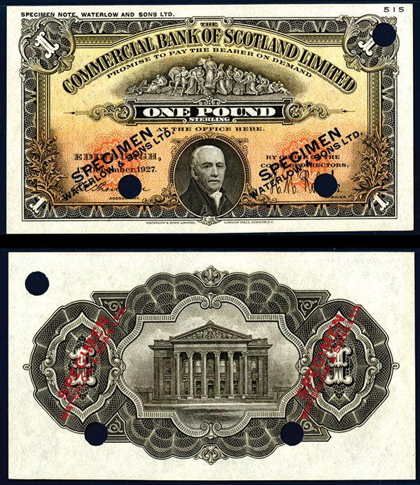 Edinburgh, Scotland. Dec.. 1, 1927, 1 Pound, P-S331s. Unlisted Color Trial SPECIMEN. John Pitcairn. Brown on yellow and orange instead of issued blue on yellow and orange, back brown. PMG graded Gem Uncirculated 66 EPQ (Exceptional Paper Quality). Waterlow & Sons. Rare Color trial of this scarce note. There are a total of 3 color trials graded by PMG, this being the highest. W&S