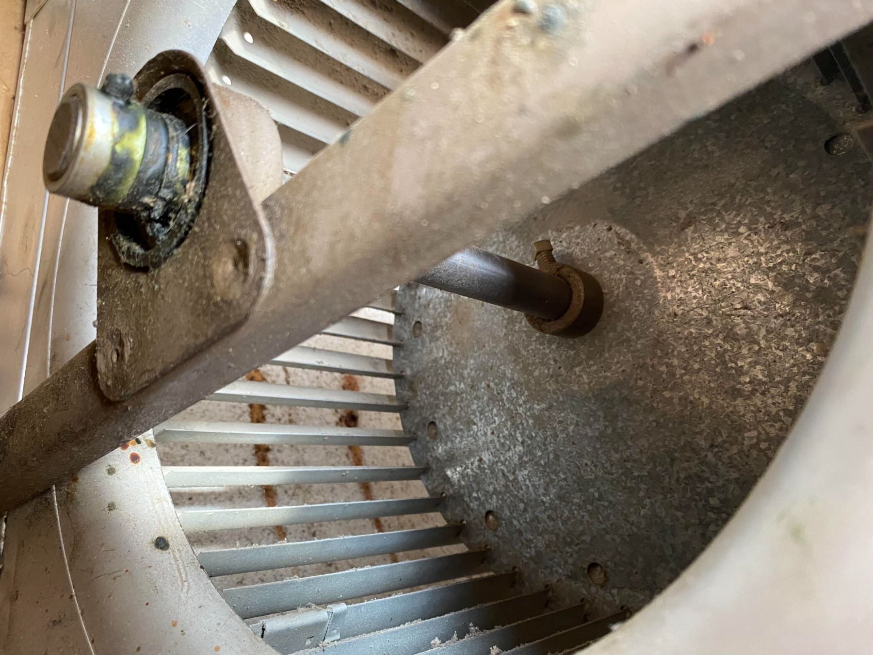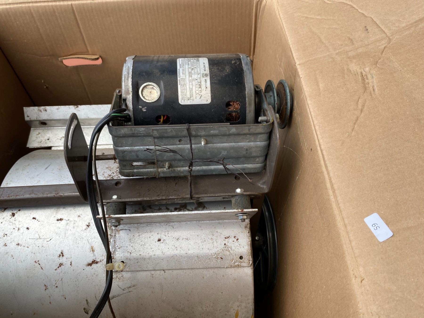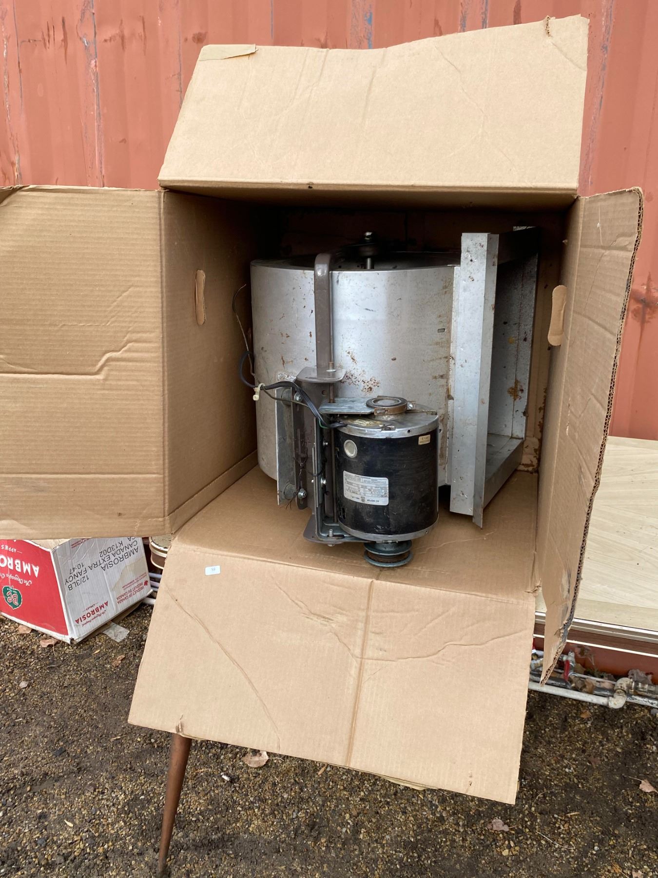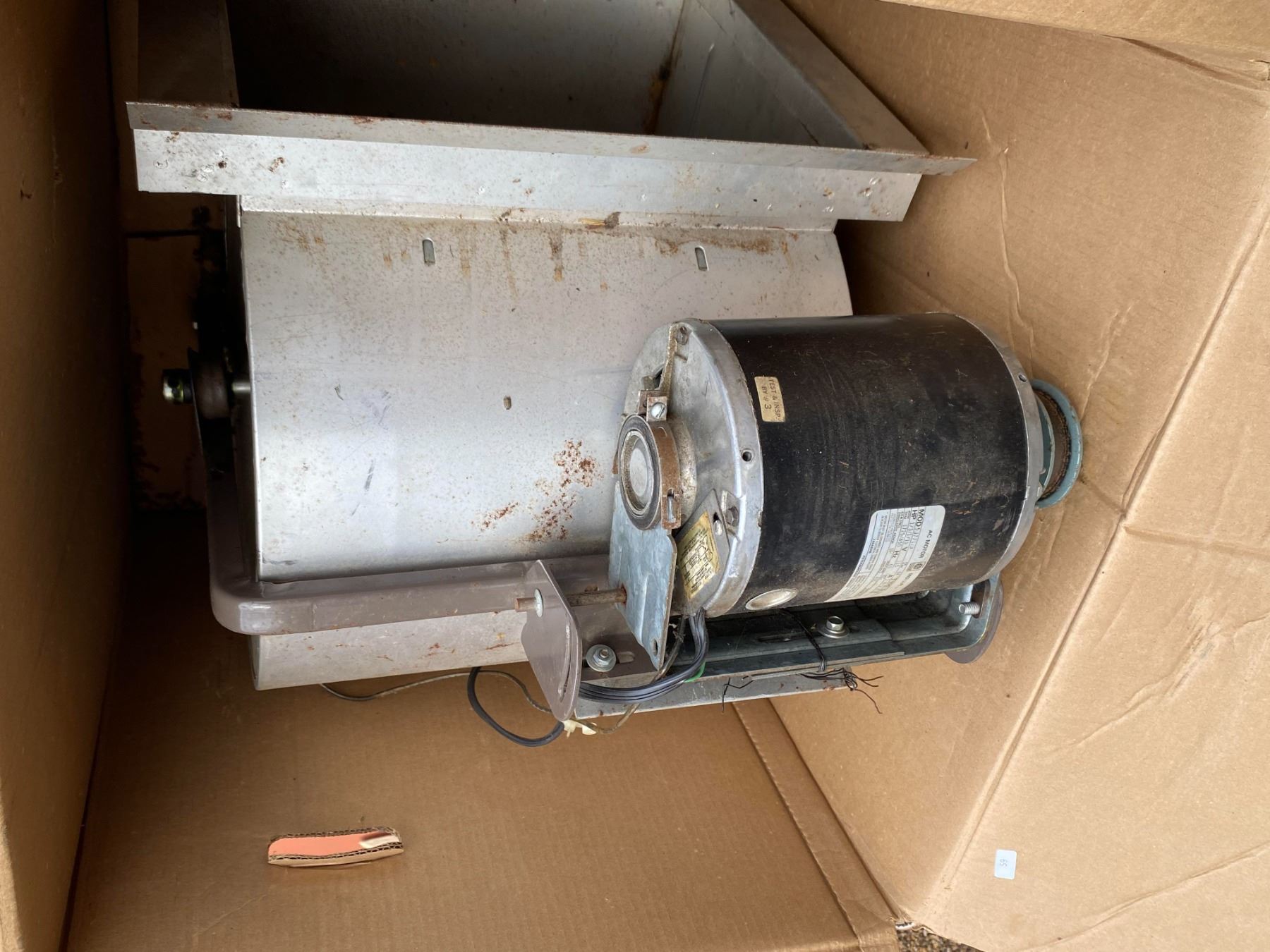 Large industrial/commercial blower motor assembly. Suitable for parts or repair. Appears untested and shows storage wear.