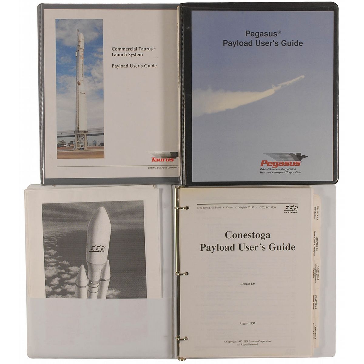 Three spiral bound payload user’s guides from Conestoga, Pegasus, and Taurus. In fine condition.