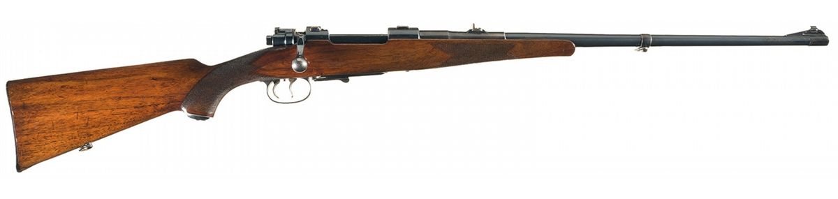 This example has the standard 8 3/4 inch length receiver with a rear square bridge. There is a beaded blade front sight on a checkered ramp with slots for a hood and a fixed rear sight with one flip up leaf. The front receiver ring is matted around the factory installed claw mount base that sits in a dovetail. The serial number "105090" is stamped on the left side of the barrel and receiver. The top flat of the bolt knob is stamped "5090". The extractor, bolt release lever, safety, bolt shroud and floor plate are all stamped "90". Equipped with double set triggers. Mounted on a multi-point checkered walnut pistol grip stock with Schnabel forearm tip, steel grip cap and checkered horn buttplate with the Mauser banner logo.