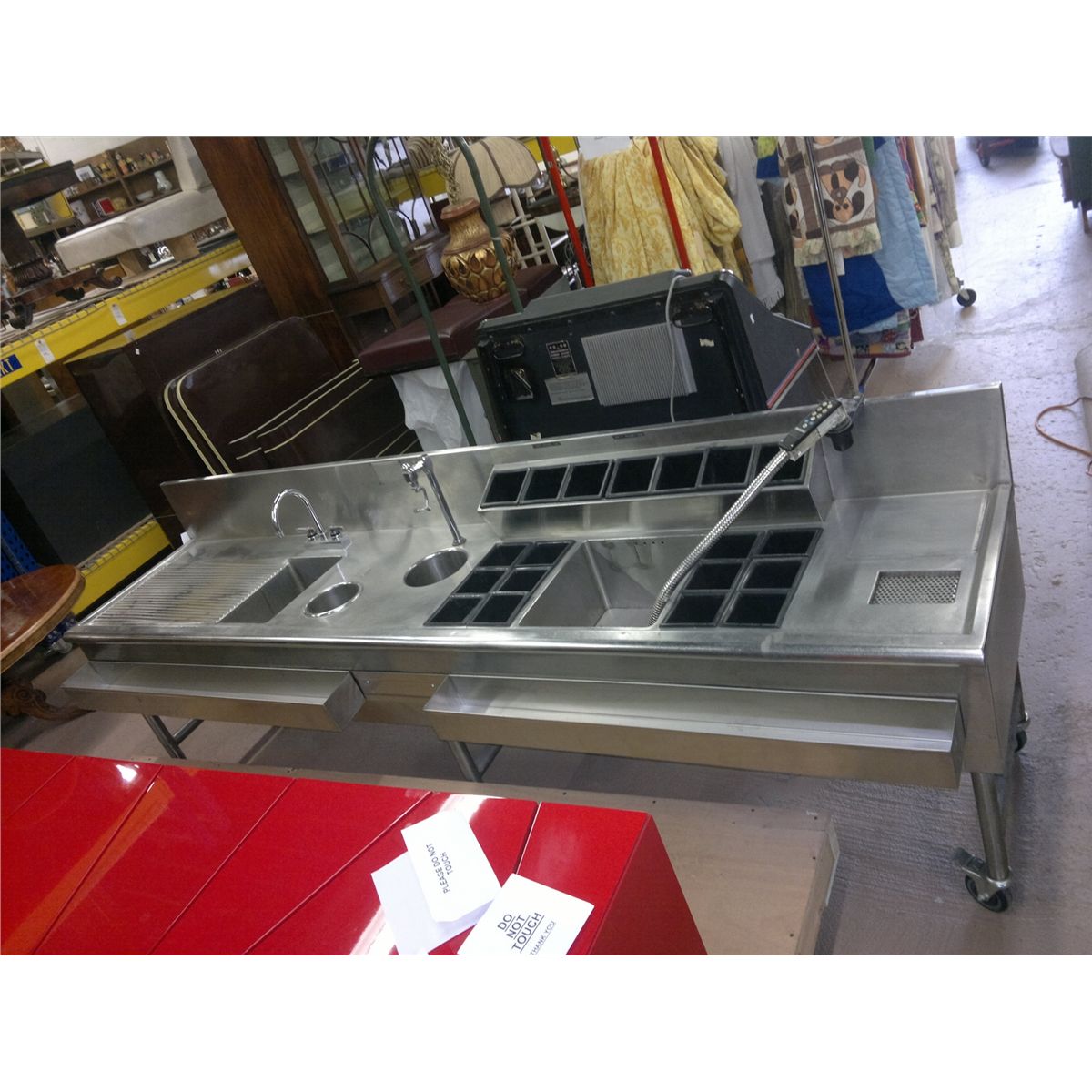 Commercial Stainless steel counter top on wheels with sink, condiment trays, spout for pop, spill guards "Quest Vancouver BC" L 107in W 28in h 39in