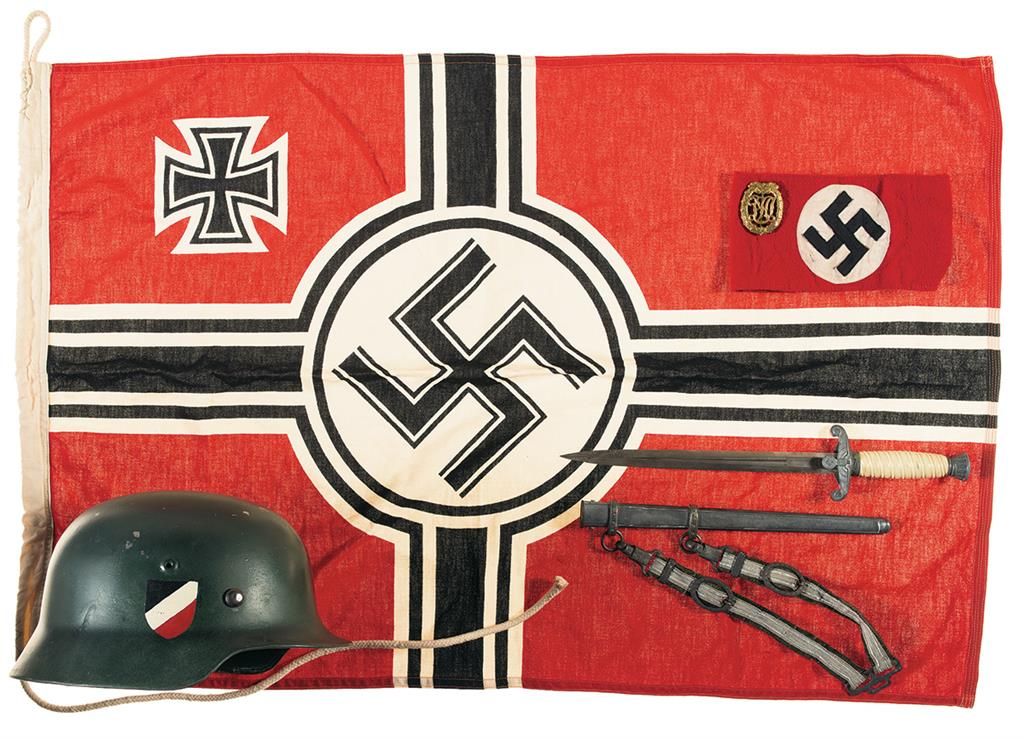 With holster and two magazines total, other Nazi style items include refinished helmet, dagger, swastika armband, 35"x22" flag, sports badge.