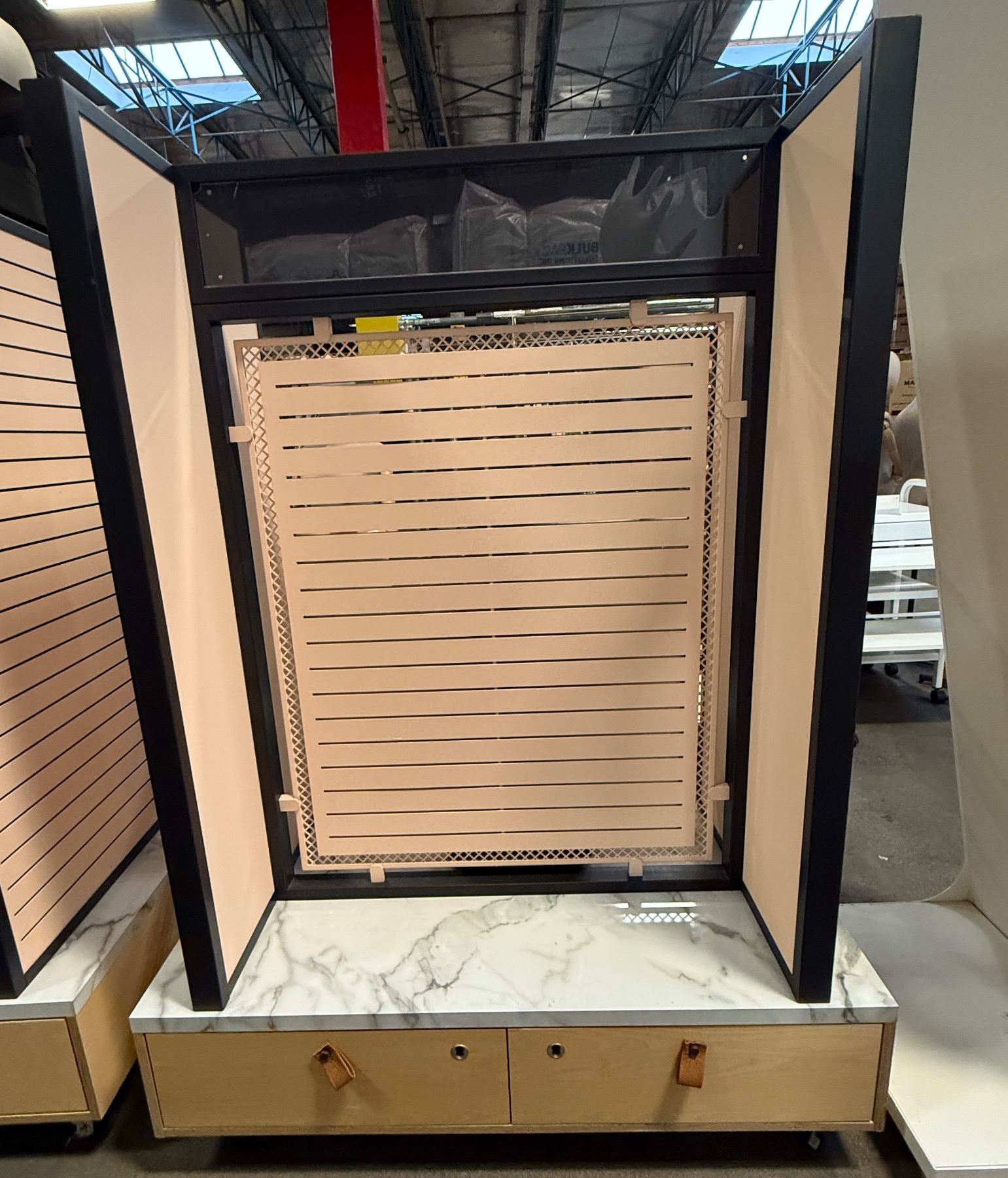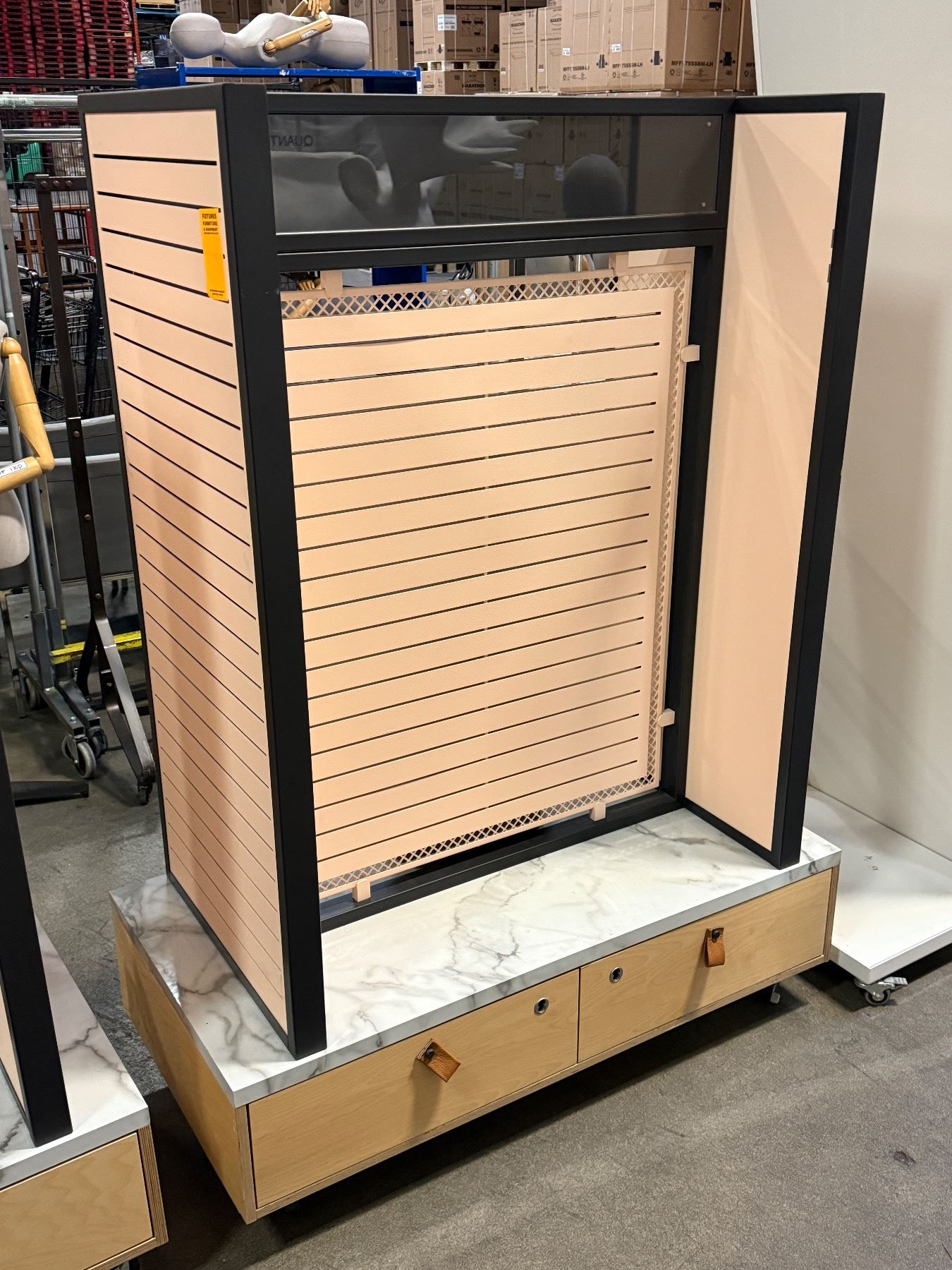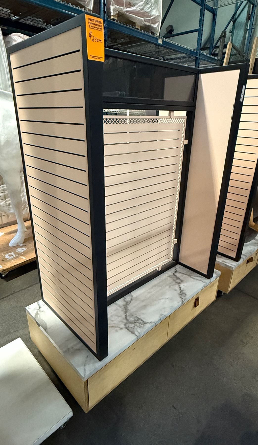Commercial heavy duty retail slatwall display gondola w/ marble base, hooks & casters - approx 4ft W