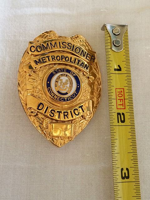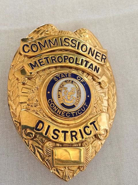 Commissioneer Metropolilitan Distric, State of Connecticut, gold and blue badge. Measures approx. 2 1/4" tall.